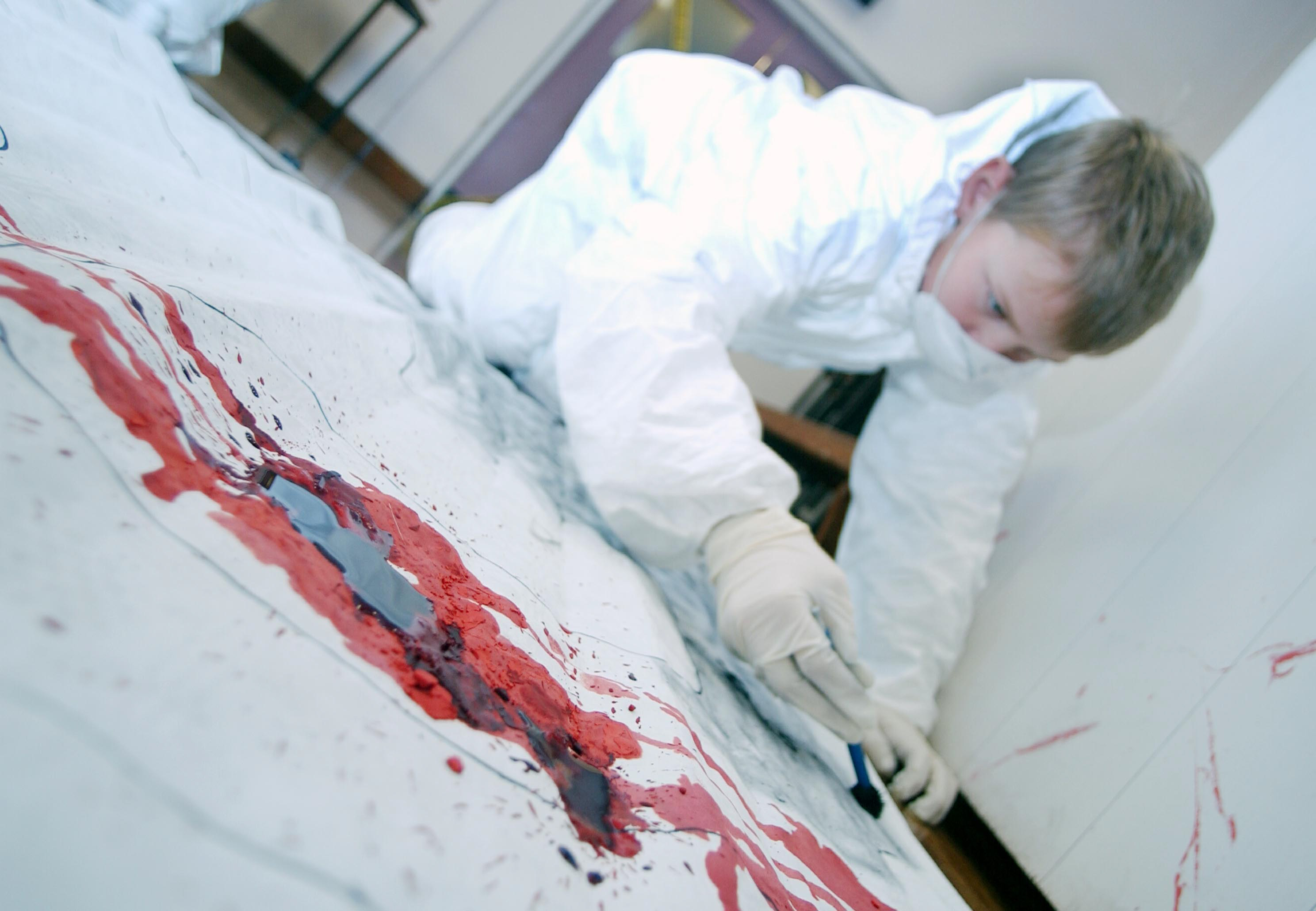 Pic by Si Barber - 07739 472 922 Children of Debenham High School, YR8 collecting evidence from a murder scene. The Suffolk School was visited by Crime Scene Science who instructed them on the skills required by Forensic Investigators. 22.11.05