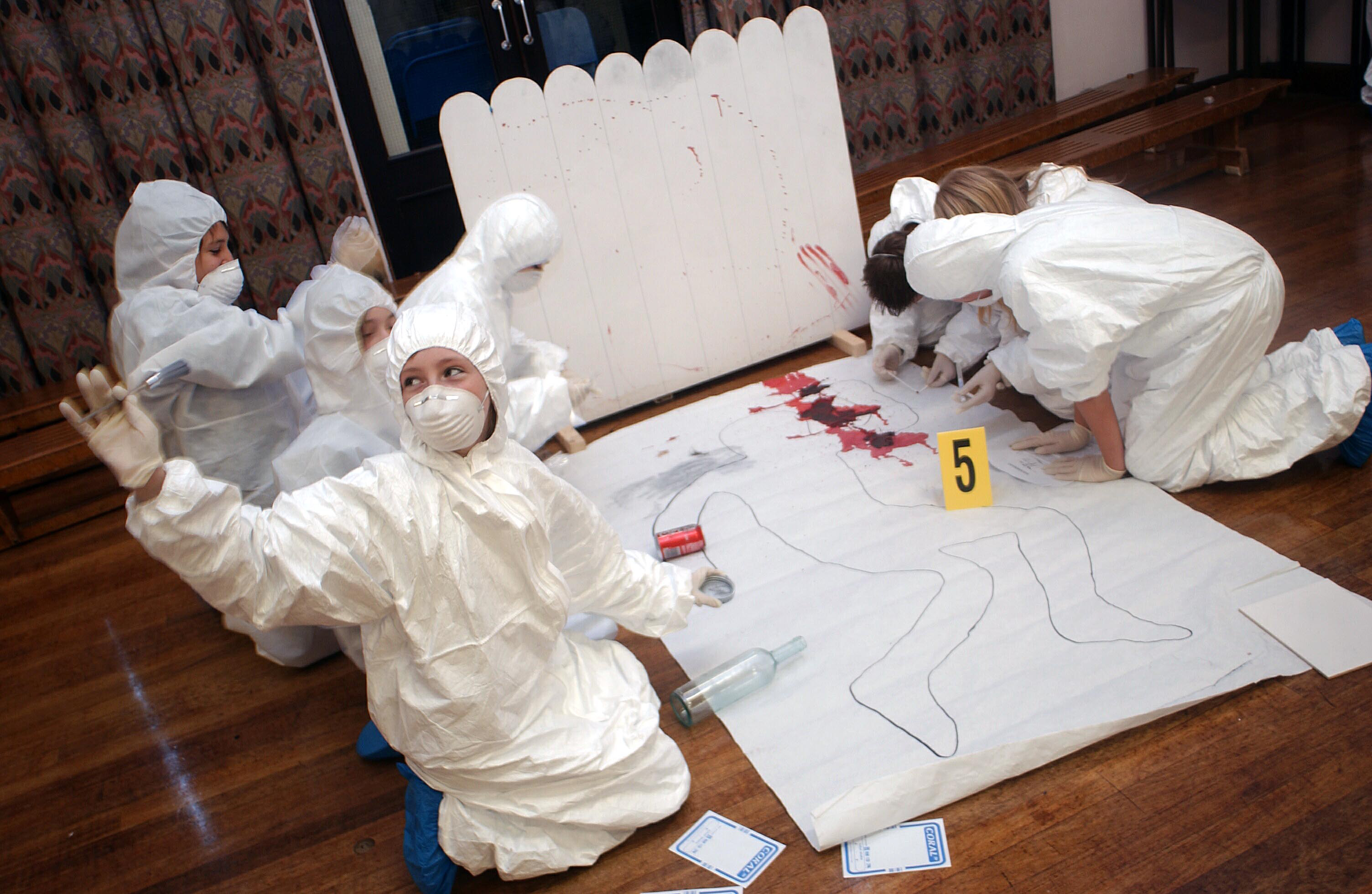 ©Si Barber. Moral rights asserted.   Pic by Si Barber - 07739 472 922 Children of Debenham High School, YR8 collecting evidence from a murder scene. The Suffolk School was visited by Crime Scene Science who instructed them on the skills required by Forensic Investigators. 22.11.05