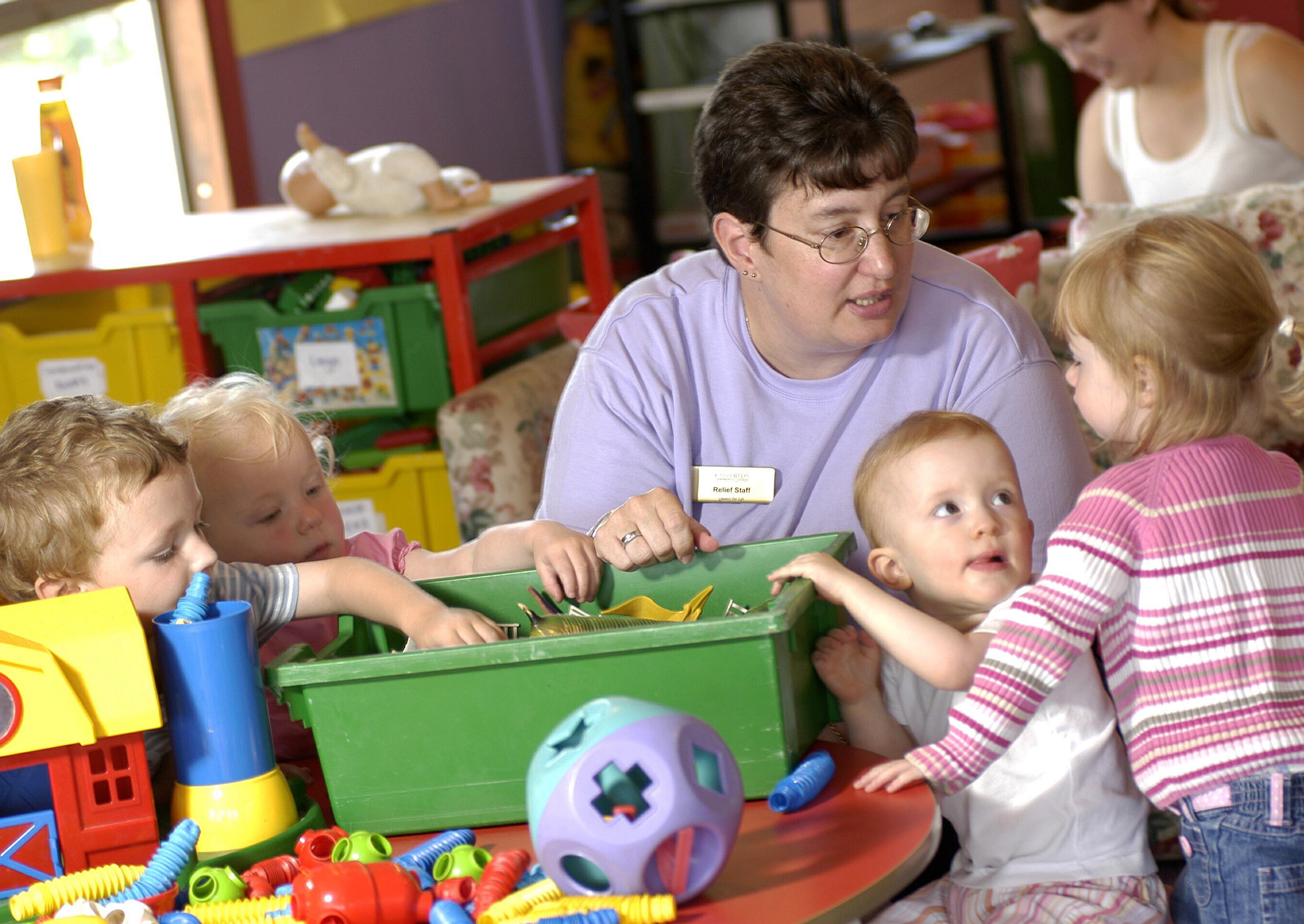bonding care caring children employees kindergarten learn learning nursery play playgroup playing staff with workers working