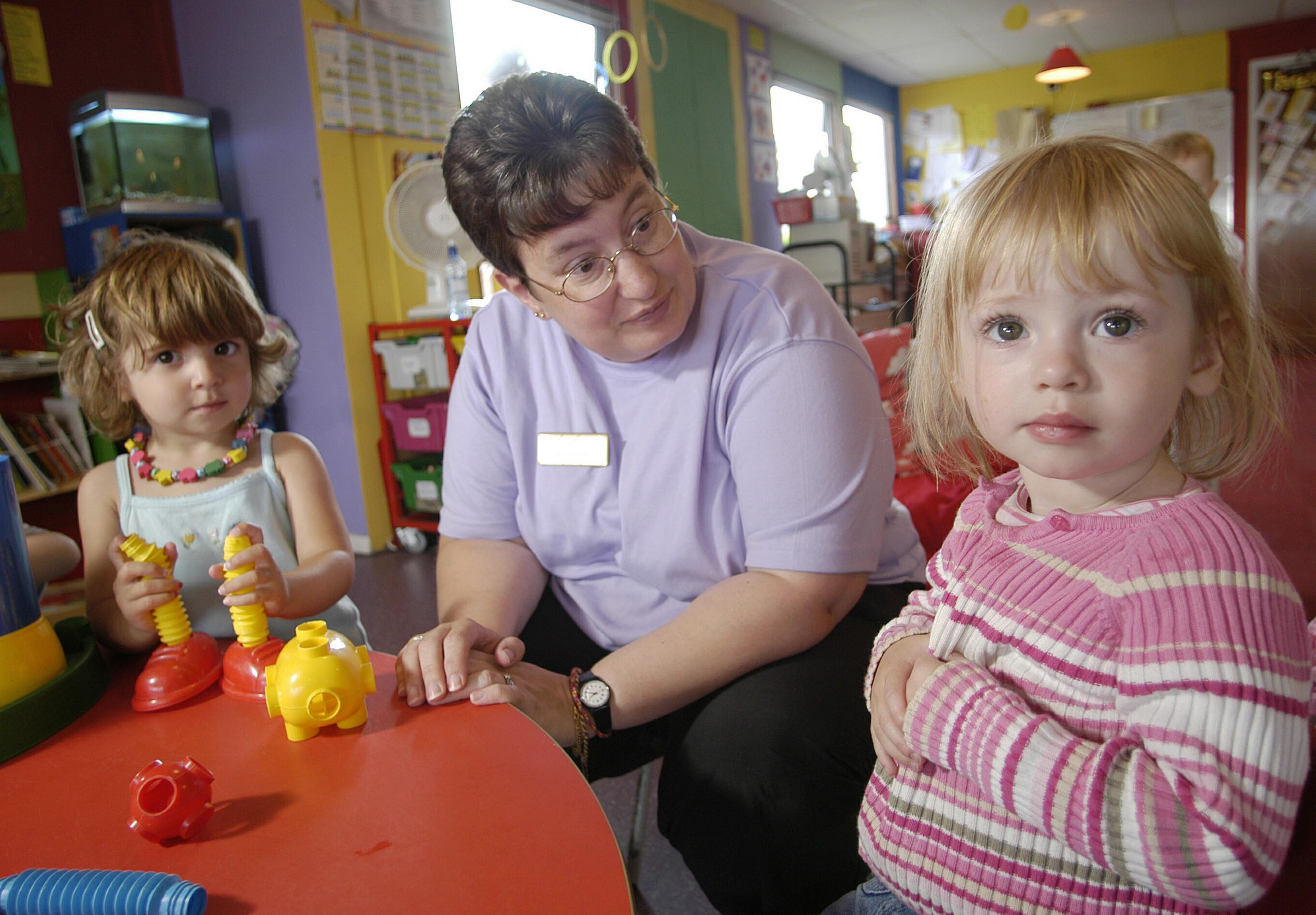 bonding care caring children employees kindergarten learn learning nursery play playgroup playing staff with workers working