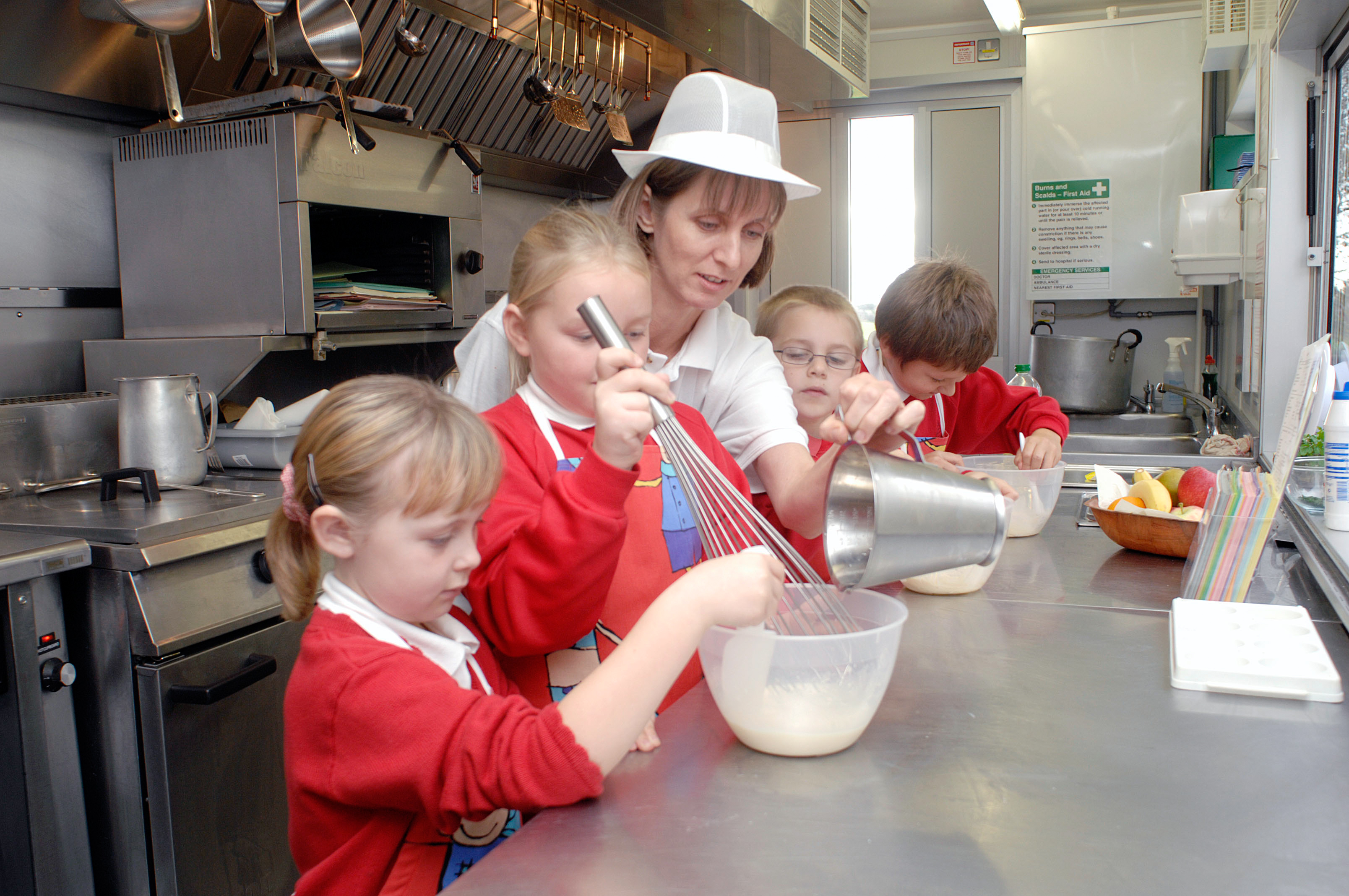Cook manager Clair Legge with Daniella & Grace, Harrison and Charles at Middleton Primary, Kings Lynn, Norfolk preparing the first ever meal to be made on the school premises in a newly installed porta-kitchen . Norfolk County Council is trying to end the system whereby 6000 meals are made daily at a central point and transported around the rural county. From today schools will have the opportunity to take advantage the initiative that aims to put a mobile kitchen in every establishment and improve the nutritional standard of meals. 311006.