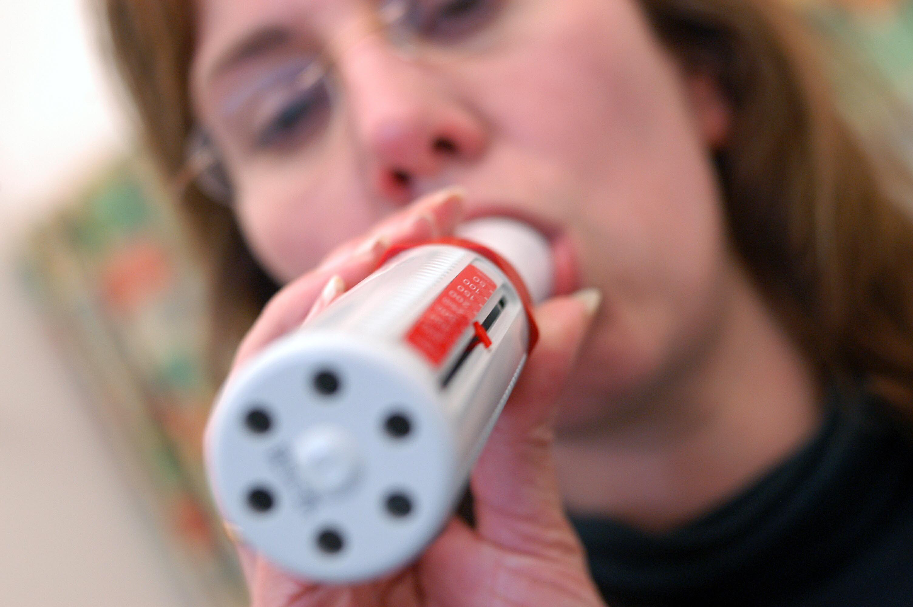 Mandatory Credit: ? Si Barber/07739 472 922 Patient using a Spirometer in a doctors surgery.