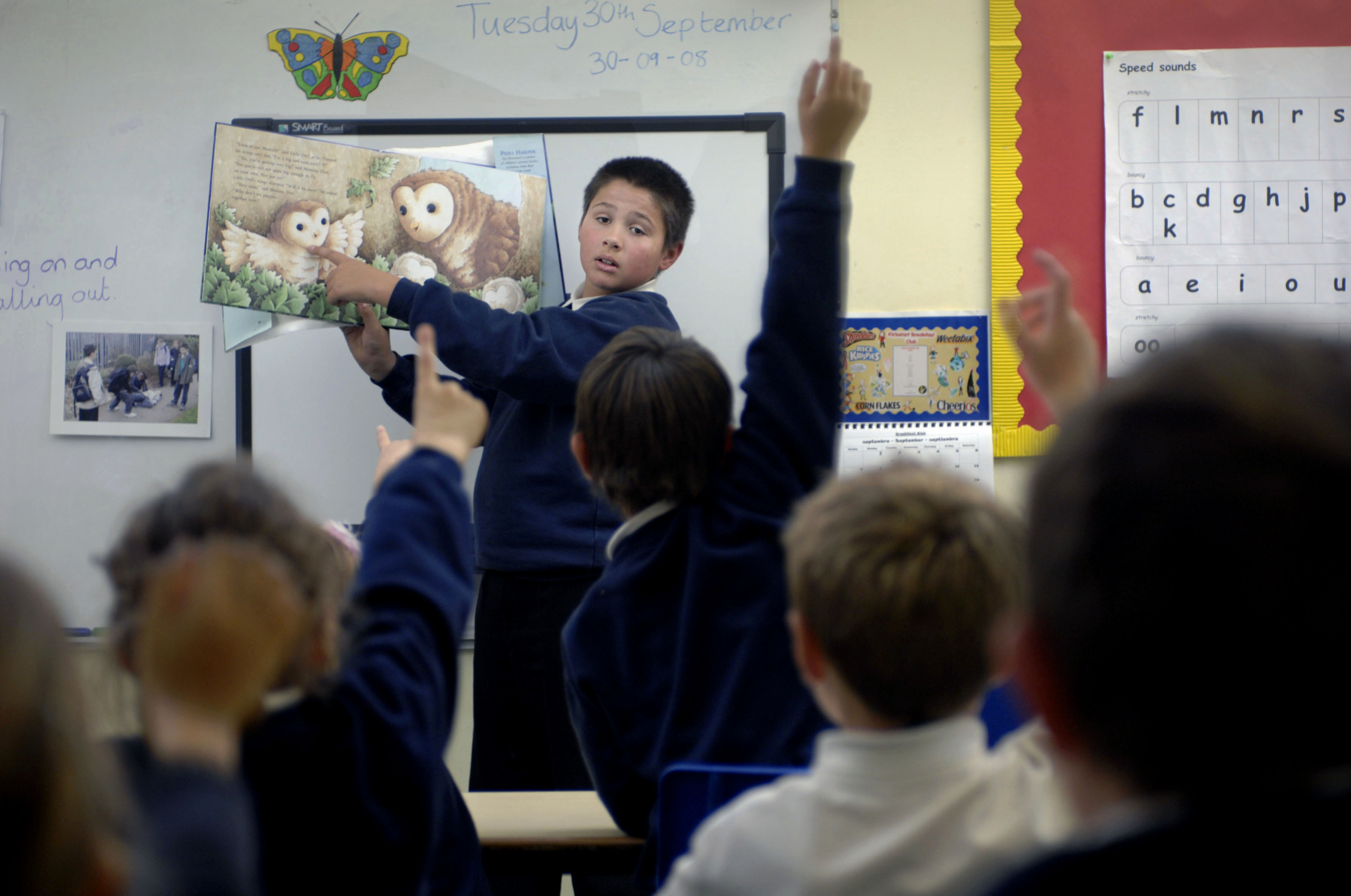 PHOTOGRAPHER - Si Barber 07739 472 922 COMMISSIONED 300908 -CHARLOTTE MAGUIRE Children of St Peter and St Paul primary school, Carbrooke,Norfolk interviewing and testing their classmates as they take over the school for a day and appoint their own teachers. Pic shows Richard teaching after sucessfully applying to become a teacher.