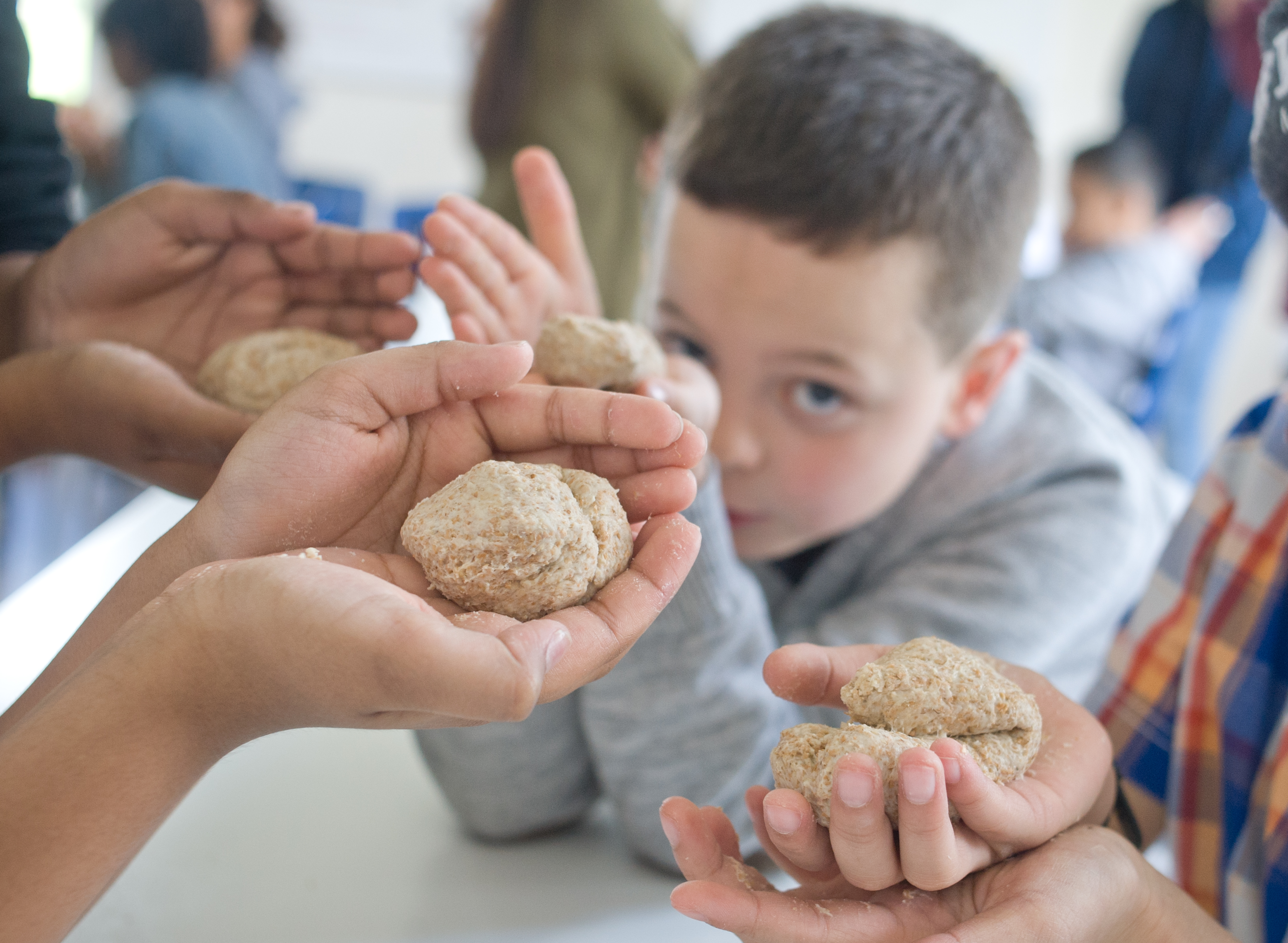 ? Si Barber 07739 472 922 Children making and eating bread from wheat flour.