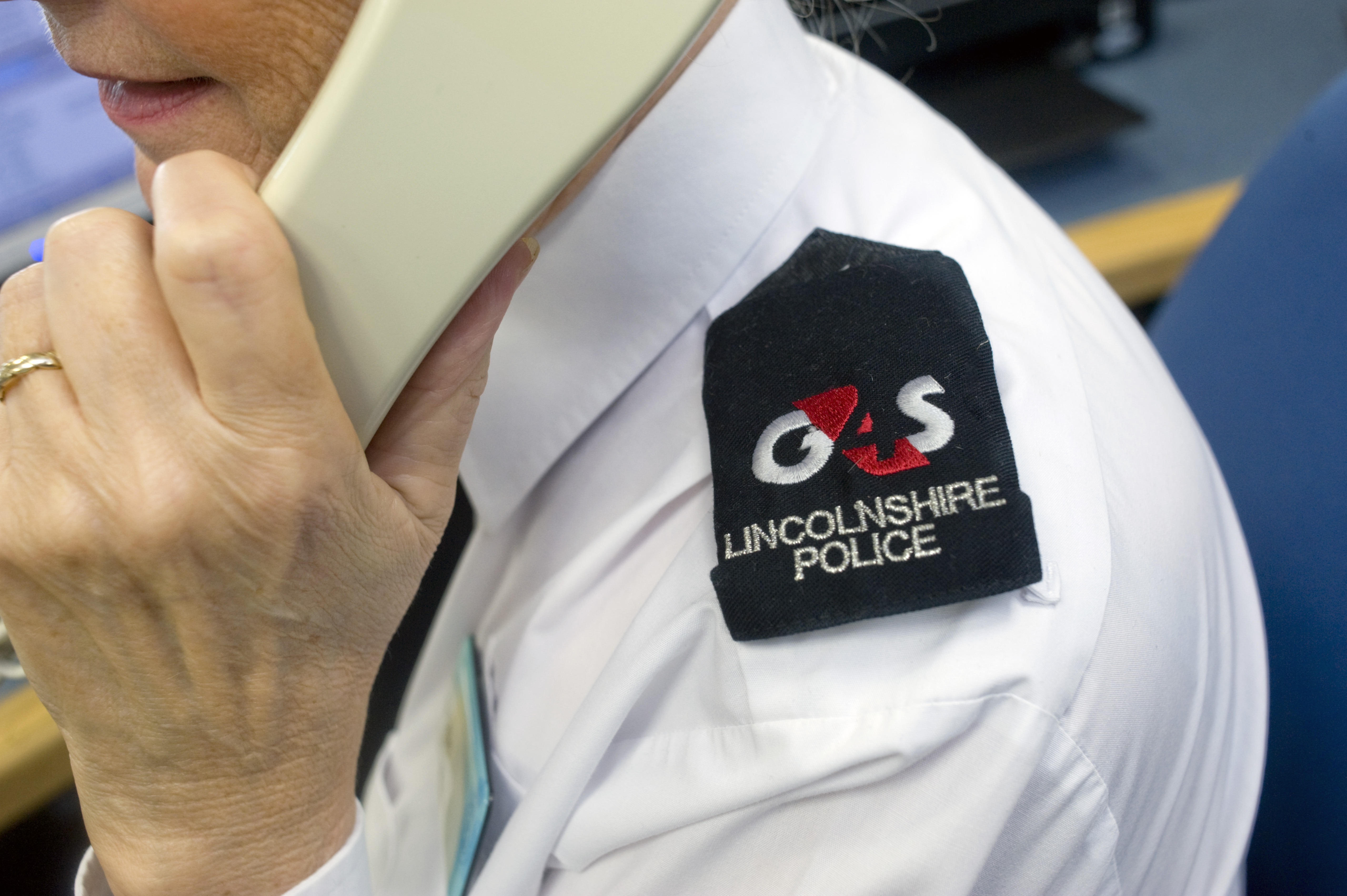 A police worker in Lincolnshire wearing an epaulette with the G4S logo. The public/private partnership, the first in the UK is thought to be a blueprint for other forces.