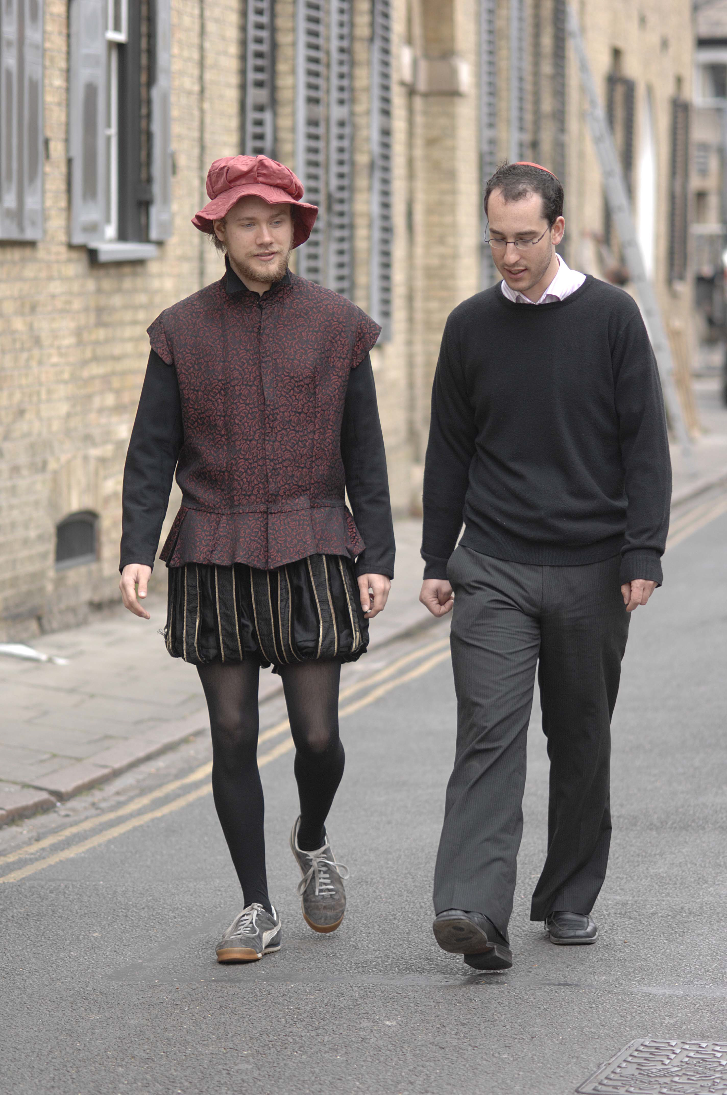 Pic by Si Barber - 07739 472 922 Cambridge student and actor Thomas Yarrow who is due to play Shylock in Shakespeare's Merchant of Venice visiting the Cambridge Synagogue to study Jewish culture with Nathan Jaffay. Pic shows modern and medieval Jewish clothing -nb In Shakespeare's time Jews were required by law to wear a red cap. Ordered by Jo Ruck 040507