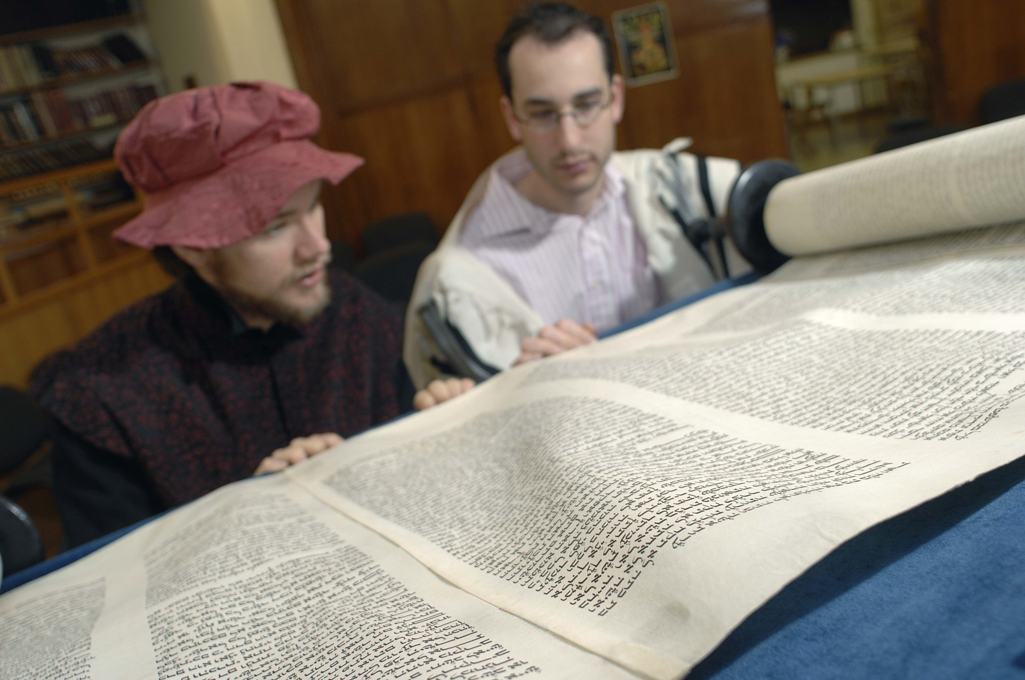 Pic by Si Barber - 07739 472 922 Cambridge student and actor Thomas Yarrow who is due to play Shylock in Shakespeare's Merchant of Venice visiting the Cambridge Synagogue to study Jewish culture with Nathan Jaffay. Pic shows Nathan Jaffay(Skullcap) and Nathan Jaffay studying the Torah . Ordered by Jo Ruck 040507
