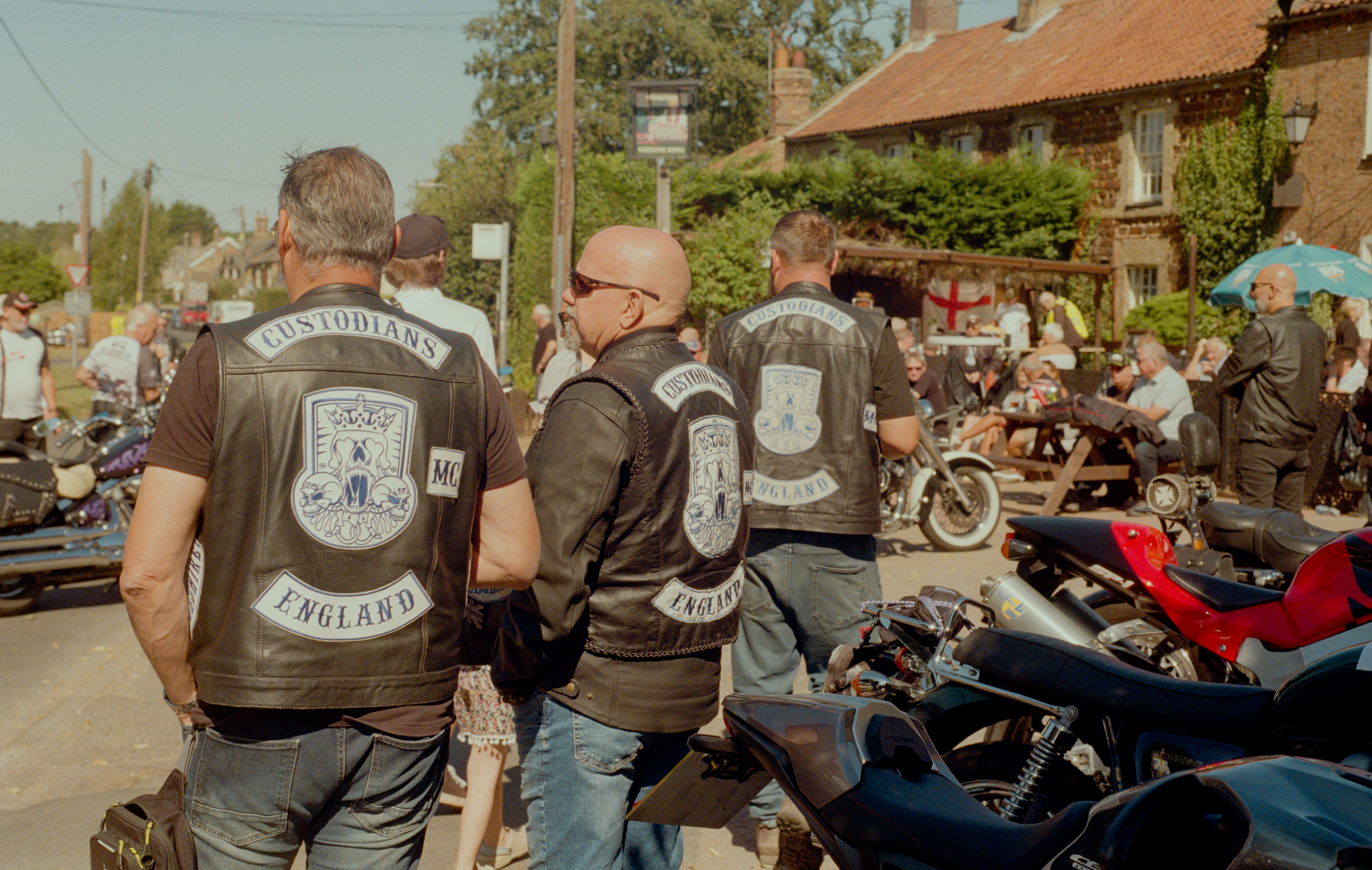 The Custodians motorcycle club at a bike meet up in Wimbotsham, Norfolk, UK