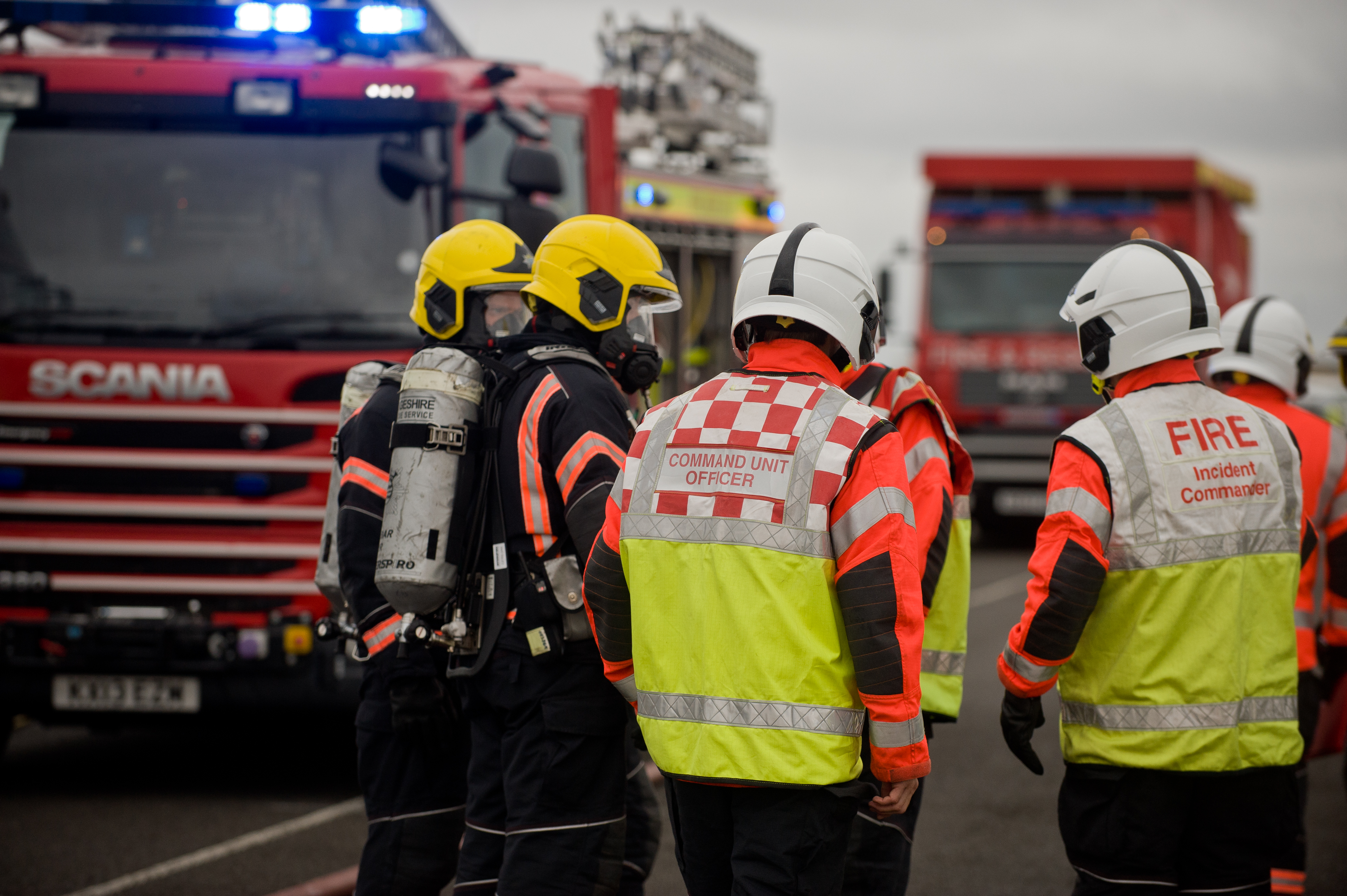 Cambridge constabulary, firefighters and emergency services conducting an exercise of dealing with a chemical accident and spillage. Picture shows: Firefighters with breathing apparatus approaching the vehicle.