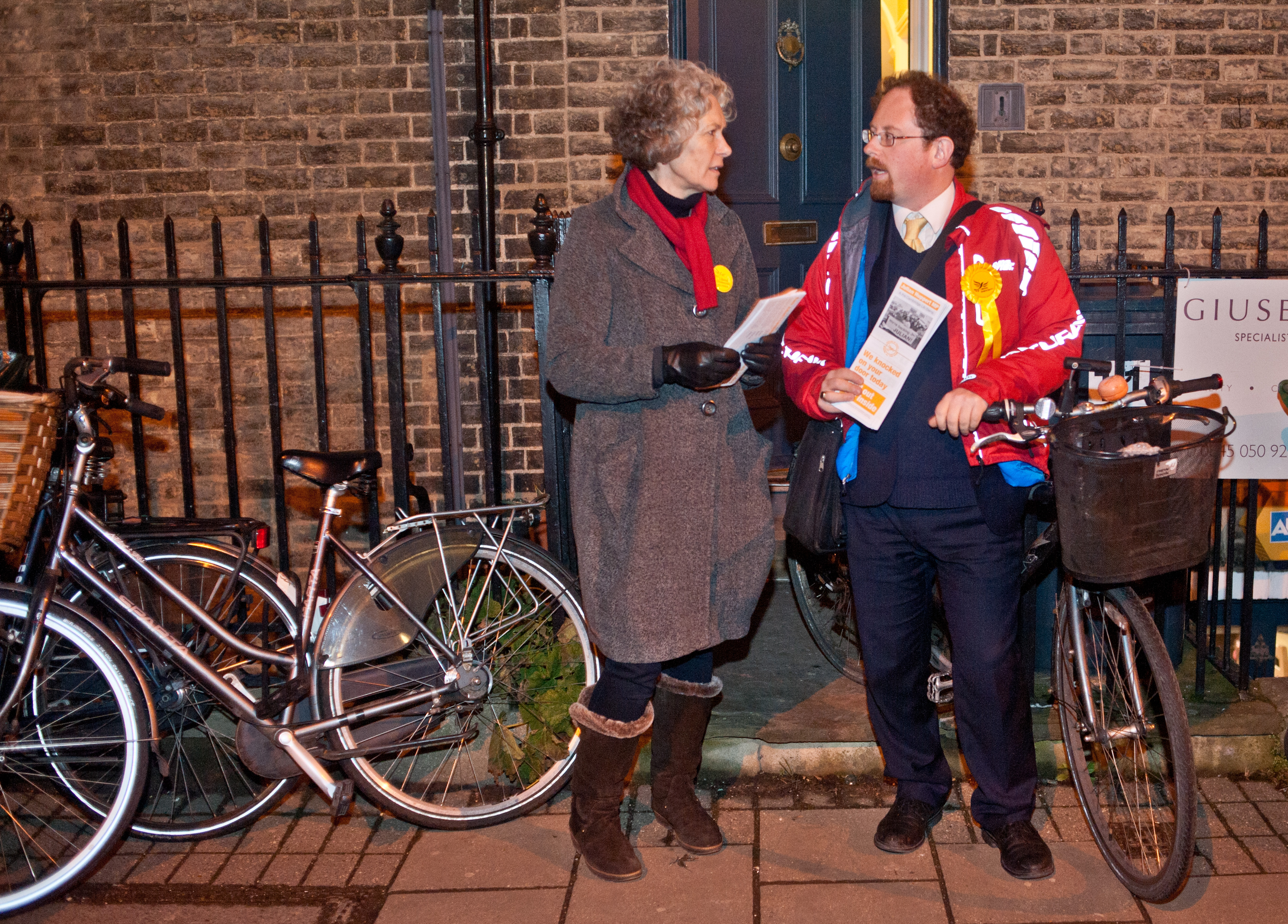 Pics ? Si Barber. Ordered by Marcus Cotton. Text by Matthew Engel. MP for Cambridge Julian Huppert canvassing with supporter Nicola Harrison.