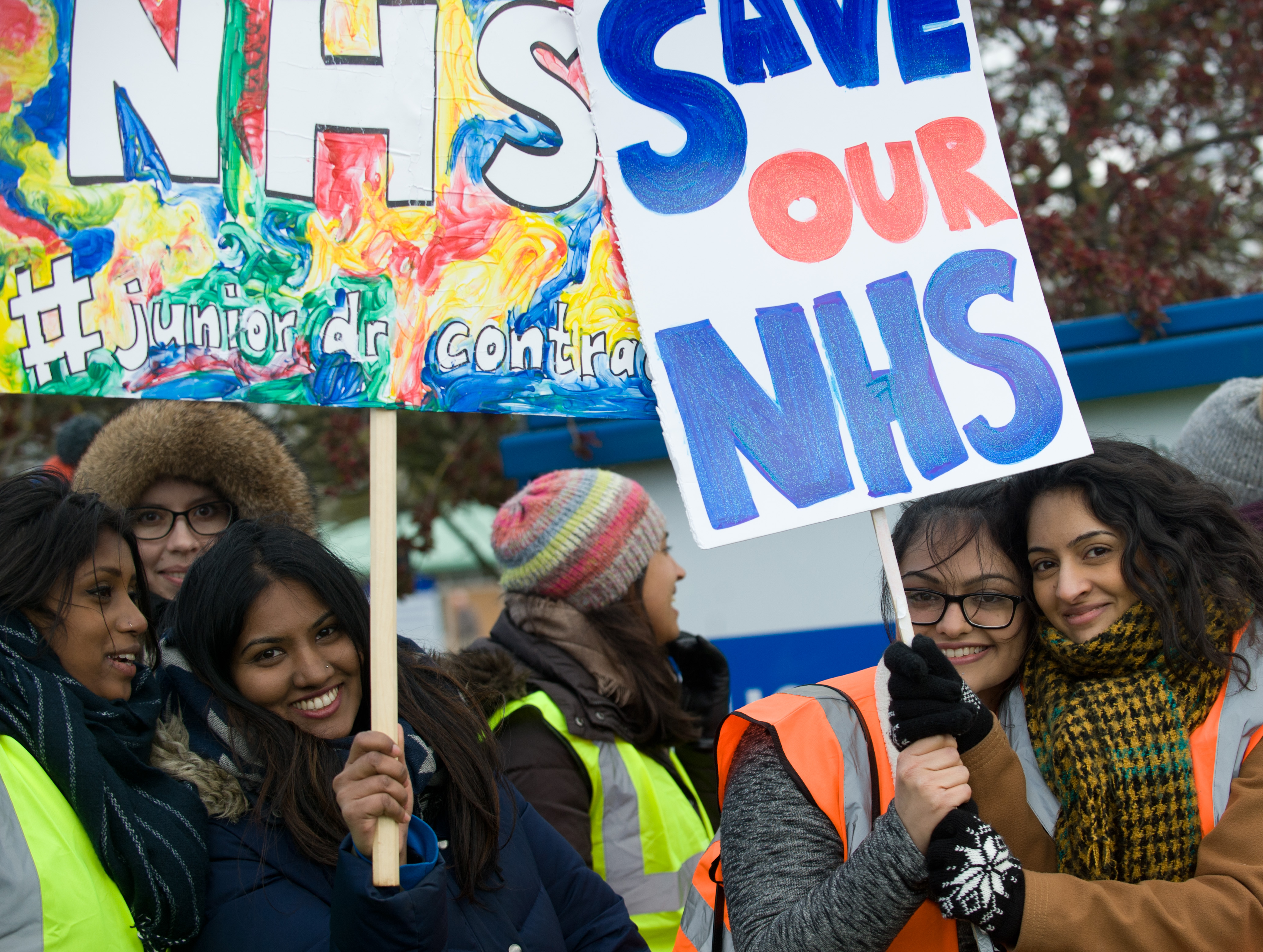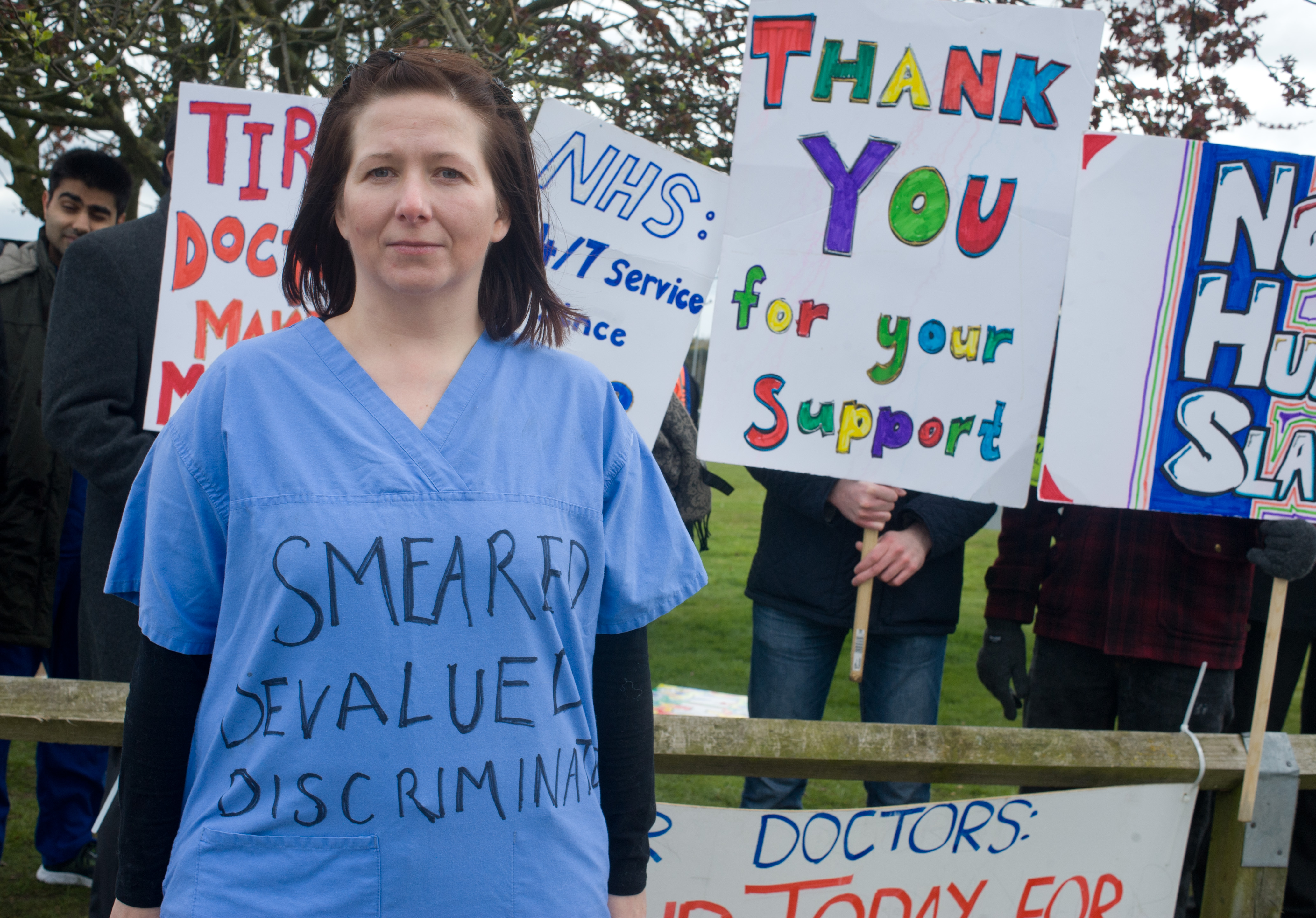 Doctor's protesting outside the Queen Elizabeth Hospital, Kings Lynn, Norfolk on the first day of their first ever strike, 26th April 2016.