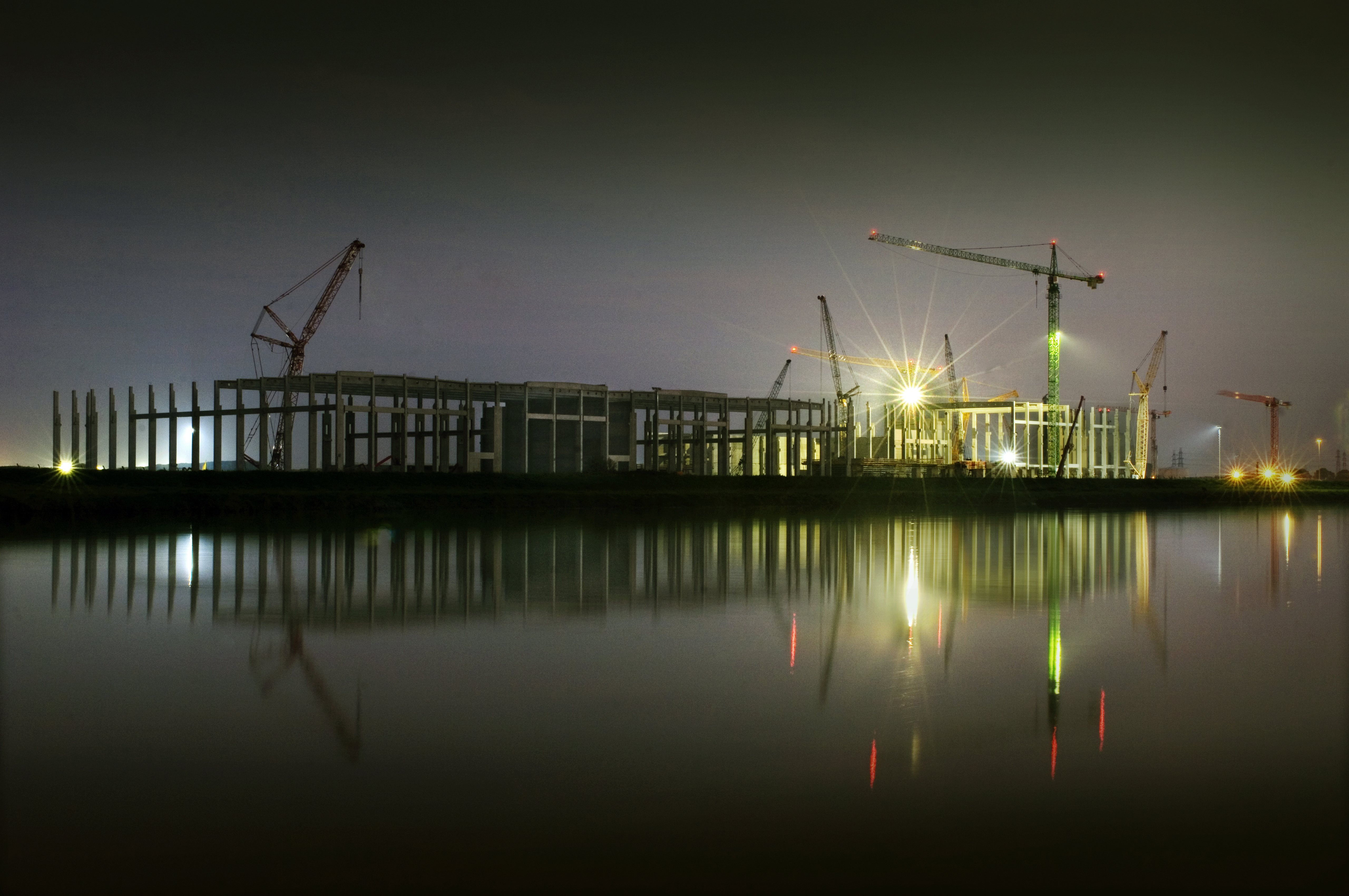 Builders work through the darkness to construct a paper recycling plant on the banks of the river Ouse in Kings Lynn, Norfolk. The scheme which is the second largest building project in the UK will, when finished process four-hundred thousand tonnes of paper each year using a 10.63 metre wide milling machine - the biggest and fastest in the world.
