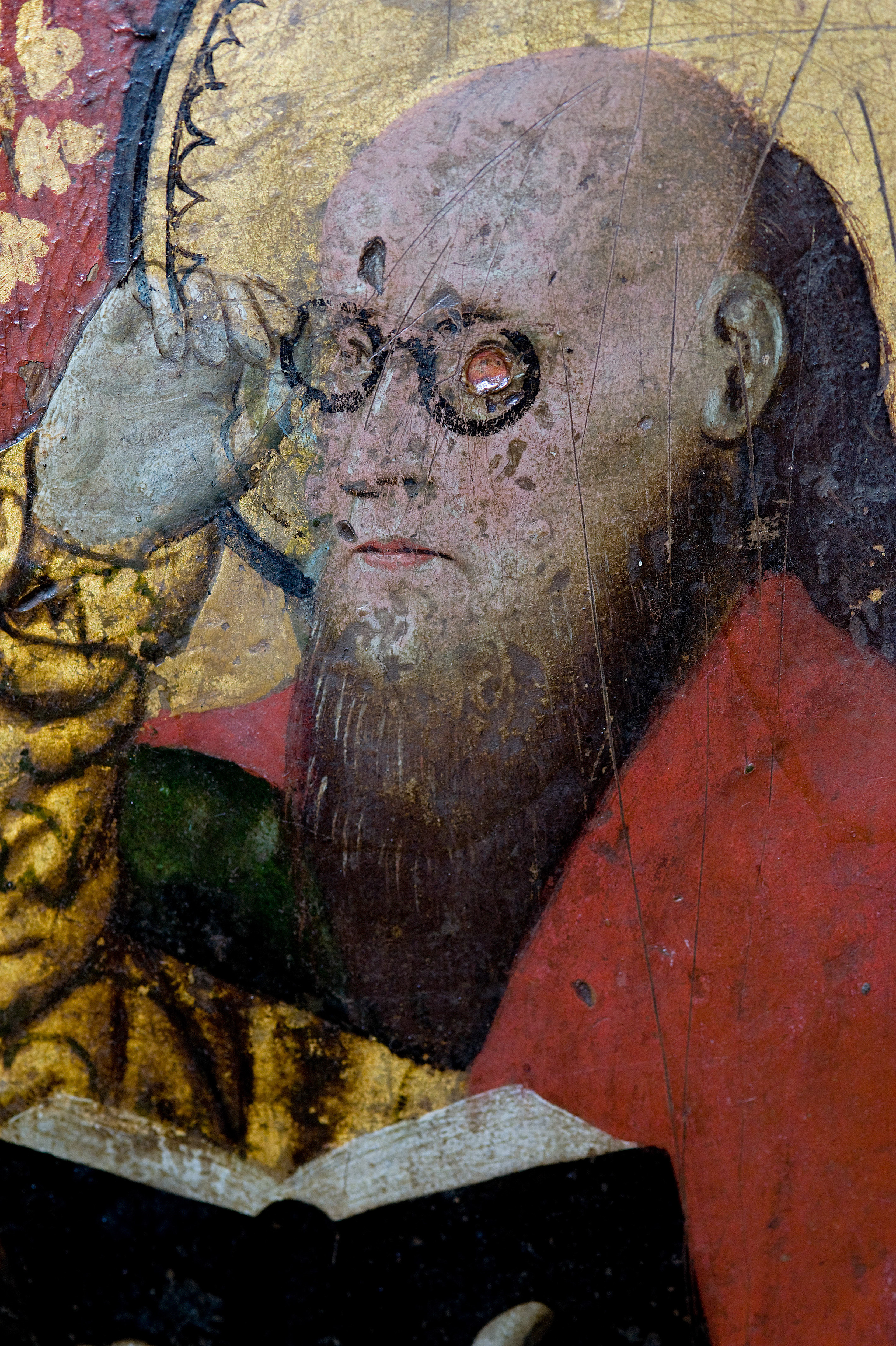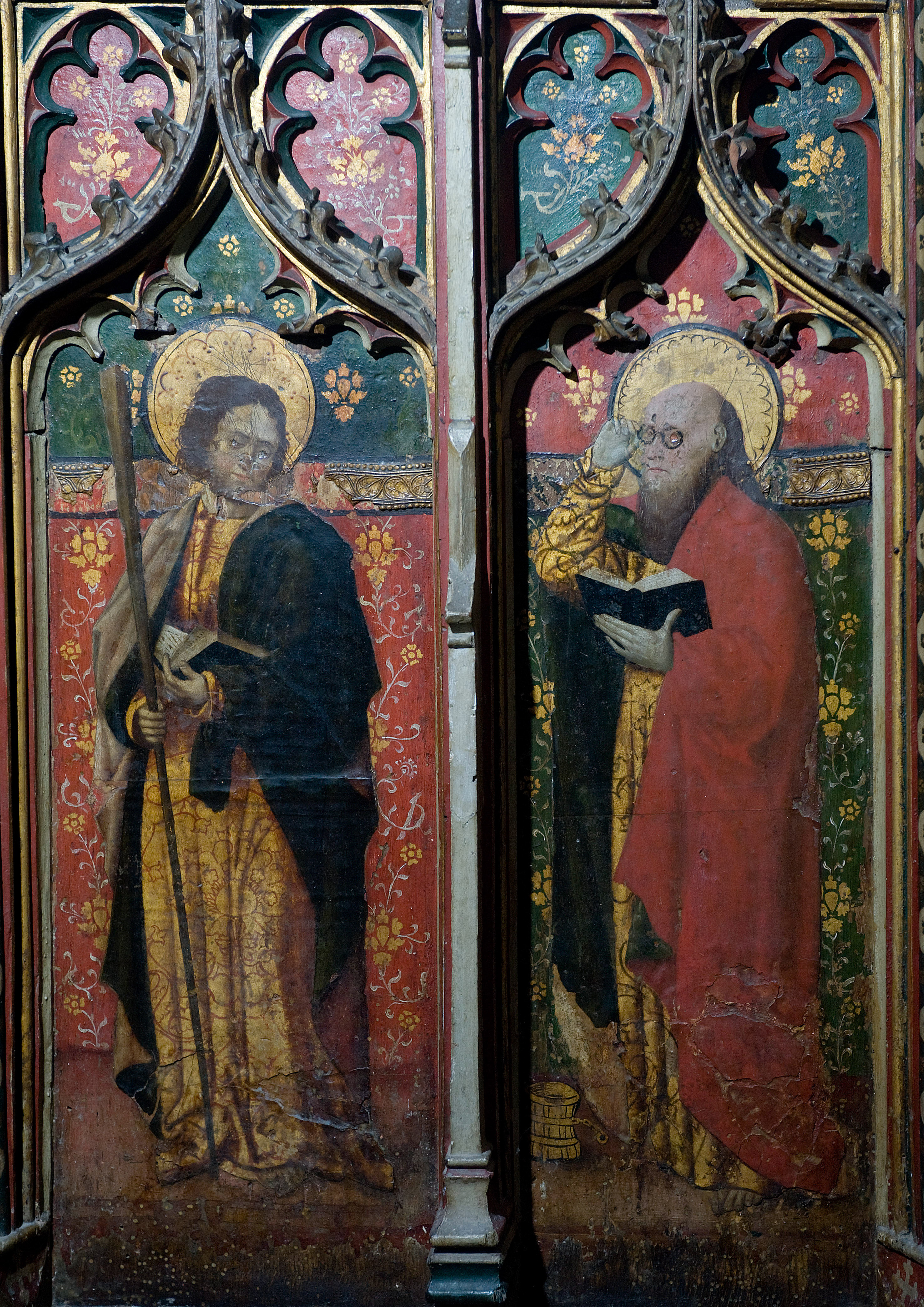 The Rood Screen and detail at St Agnes Church, Cawston, Norfolk. From the North (left) side the screens depict St Agnes , St Helena , St Thomas , St John , St James , St Andrew , St Paul, St Peter, . On the south side, St James, St Bartholomew , St Philip, St Jude, St Simon , St Matthew , St Matthias, Sir John Schorn.