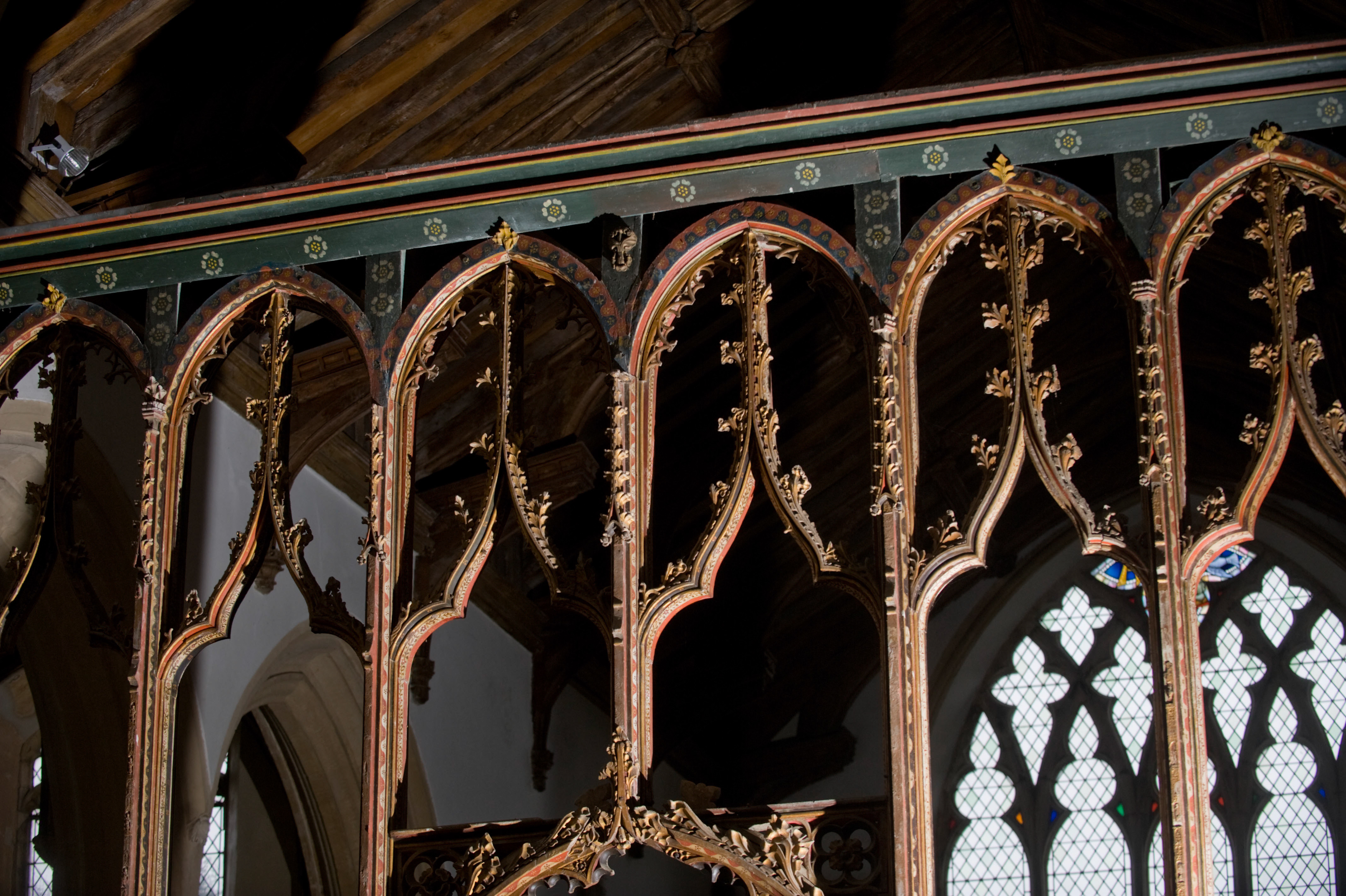 The Rood Screen and detail at St Agnes Church, Cawston, Norfolk. From the North (left) side the screens depict St Agnes , St Helena , St Thomas , St John , St James , St Andrew , St Paul, St Peter, . On the south side, St James, St Bartholomew , St Philip, St Jude, St Simon , St Matthew , St Matthias, Sir John Schorn.