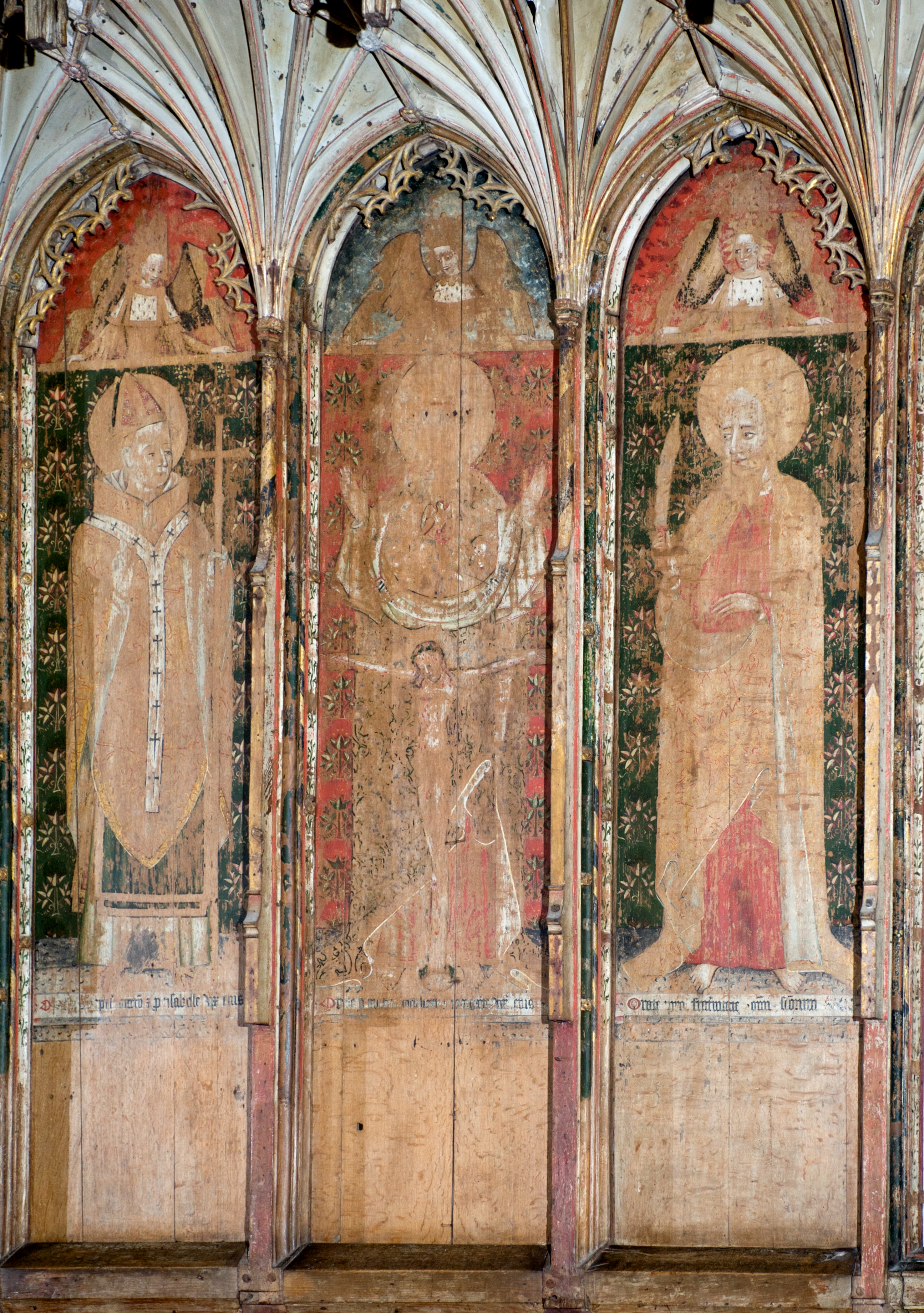 The rood screen and detail at St Mary's Church, Attleborough, Norfolk,UK. From the North (left) side, St John the Baptist , St John the Evangelist , the Blessed Virgin and Child. On the South side St Thomas of Canterbury, the Holy Trinity, and St Bartholomew. The church features a wall painting of the annunciation.