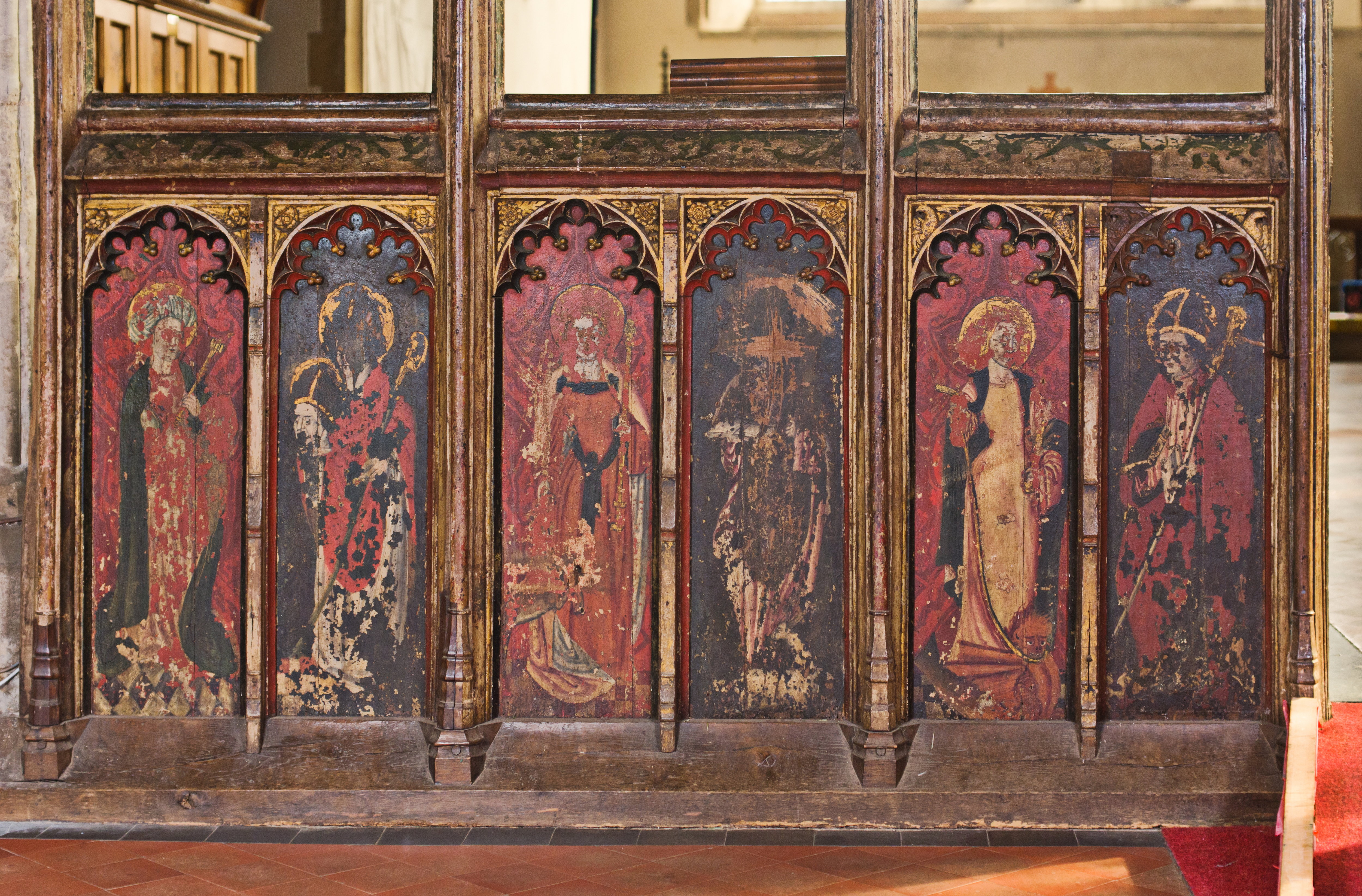 The rood screen and detail at St Nicholas' Church, Dersingham, Norfolk,UK. The figures depicted (l-r) are; St Apollonia, St Denys St Withburga,St Giles,St Juliana and St Cyprian.