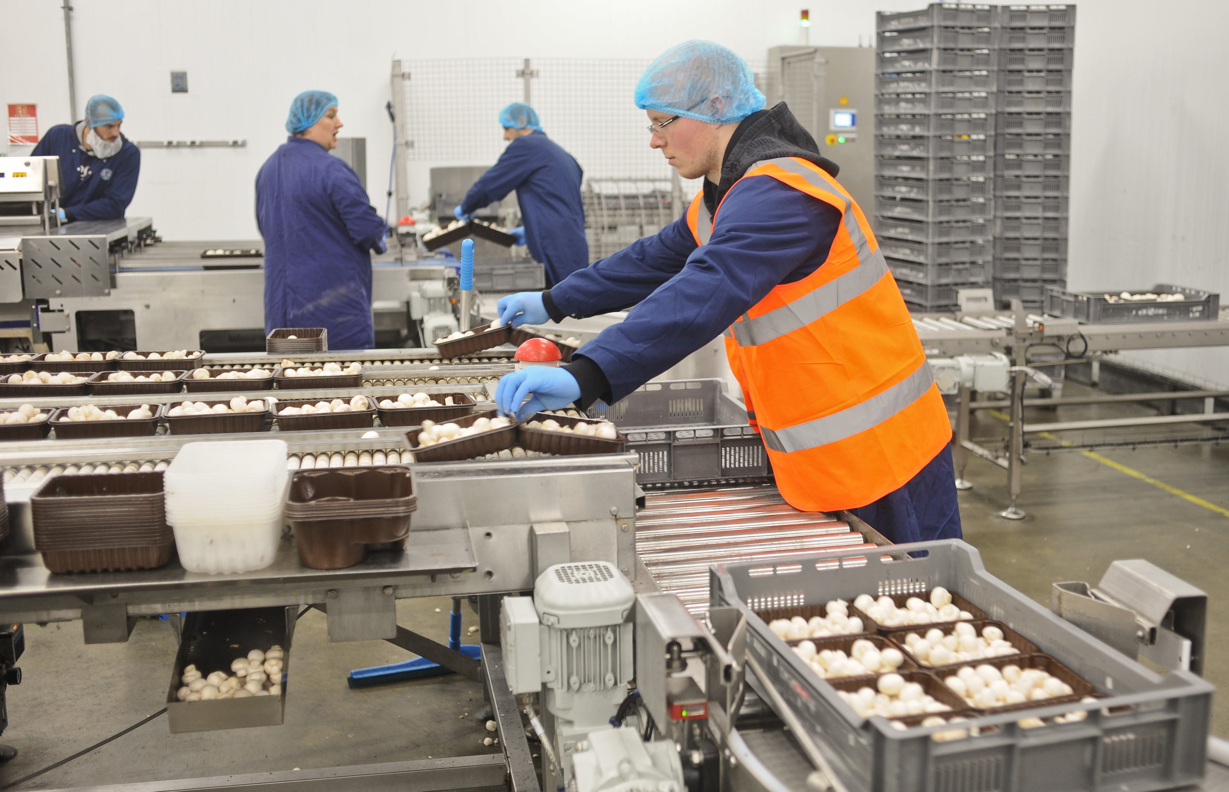 G's vegetable growers near Ely in Cambridgeshire. The company employs and provides accommodation and facilities for many workers from Eastern Europe. Picture shows - Mushroom growing and processing.
