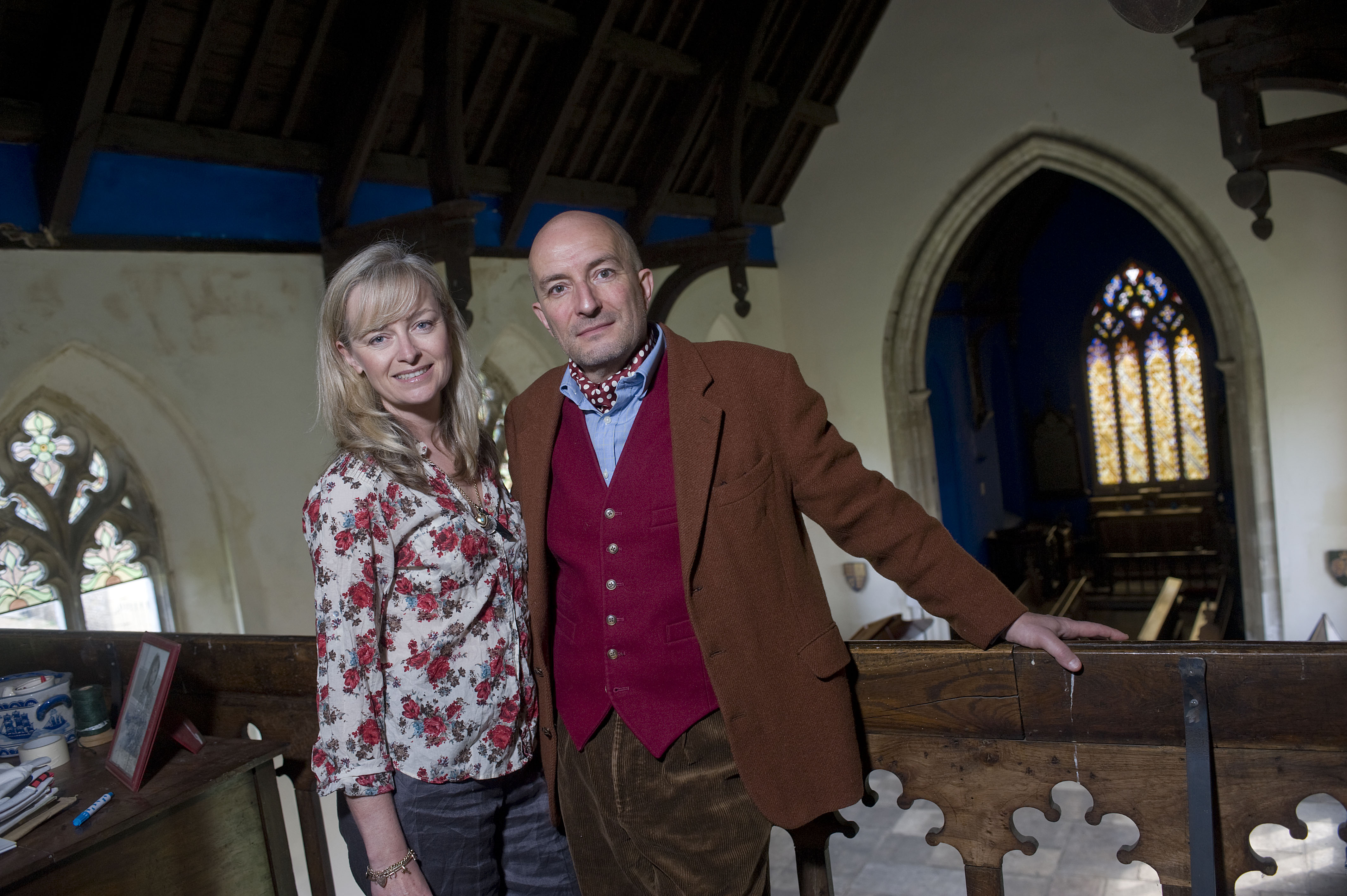 Kit and Kate Hesketh Harvey with their church in Stoke Ferry, Norfolk.