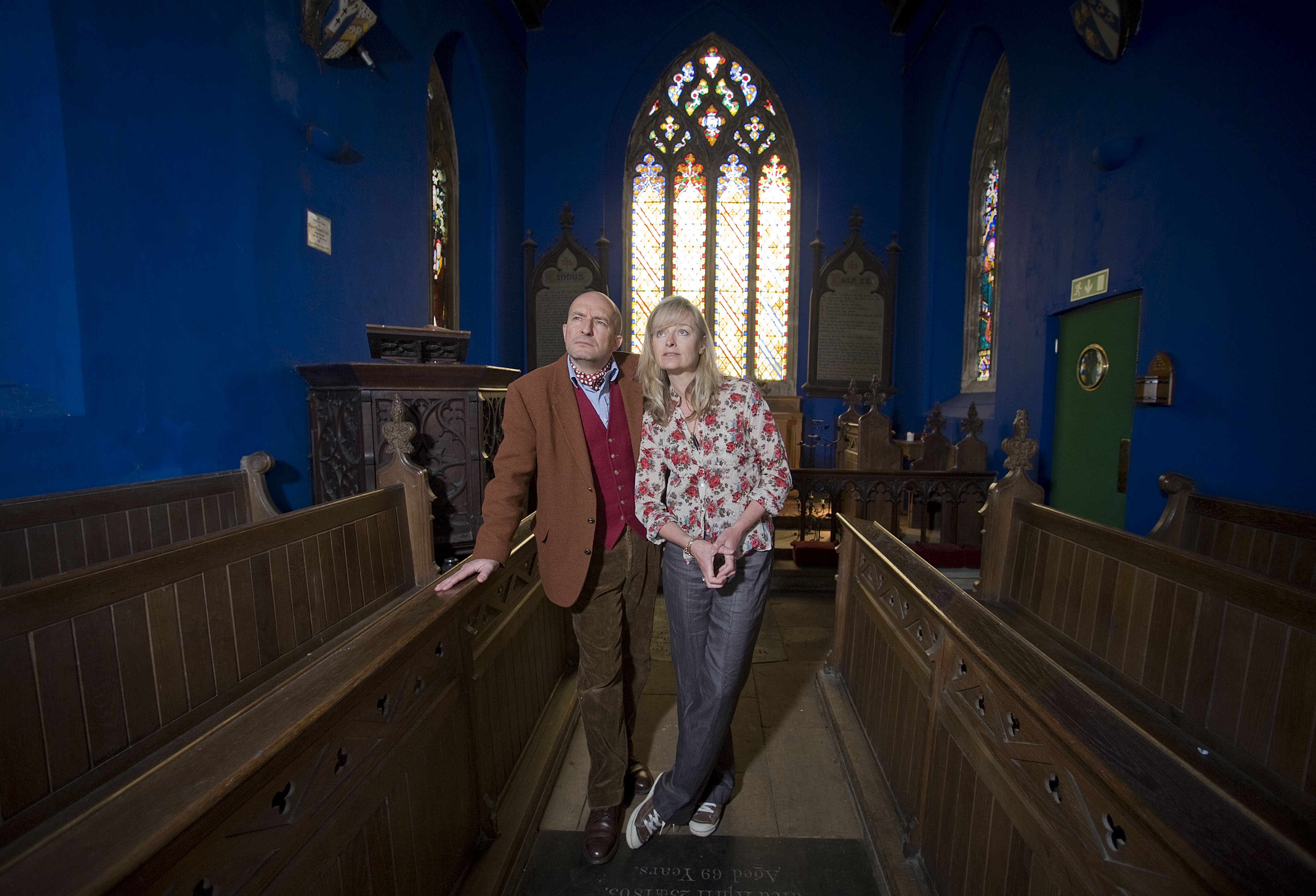 Kit and Kate Hesketh Harvey with their church in Stoke Ferry, Norfolk.