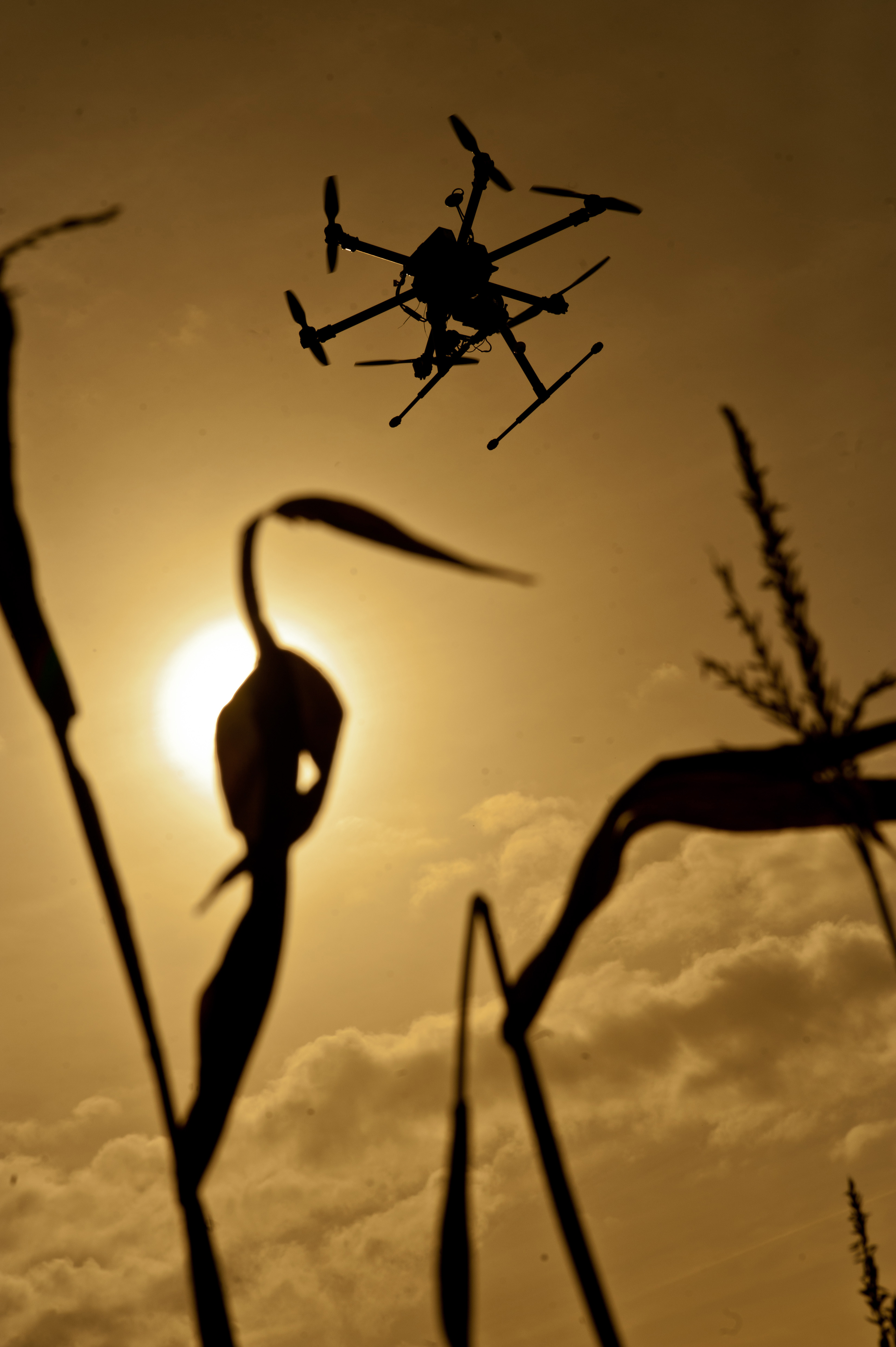 A pilot flying an agricultural drone over a crop of sweetcorn
