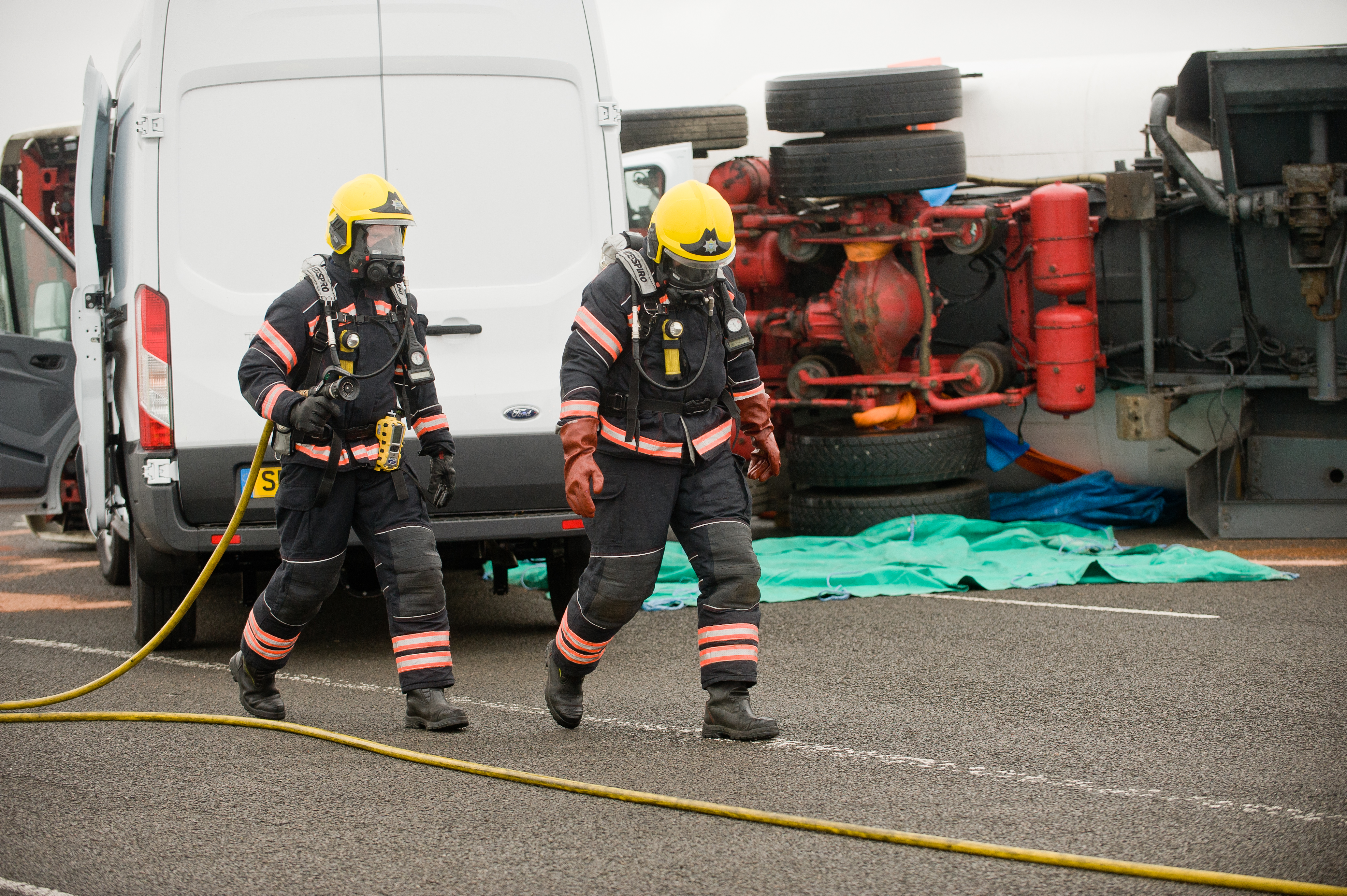 accident cambridge chemical closure constabulary danger emergency equipment equipped exercise firefighter firefighters firemen fumes hgv injured injuries injury lorry officers police practice practise primary proctective recovery rehearse road services spill spillage tanker walking wounded