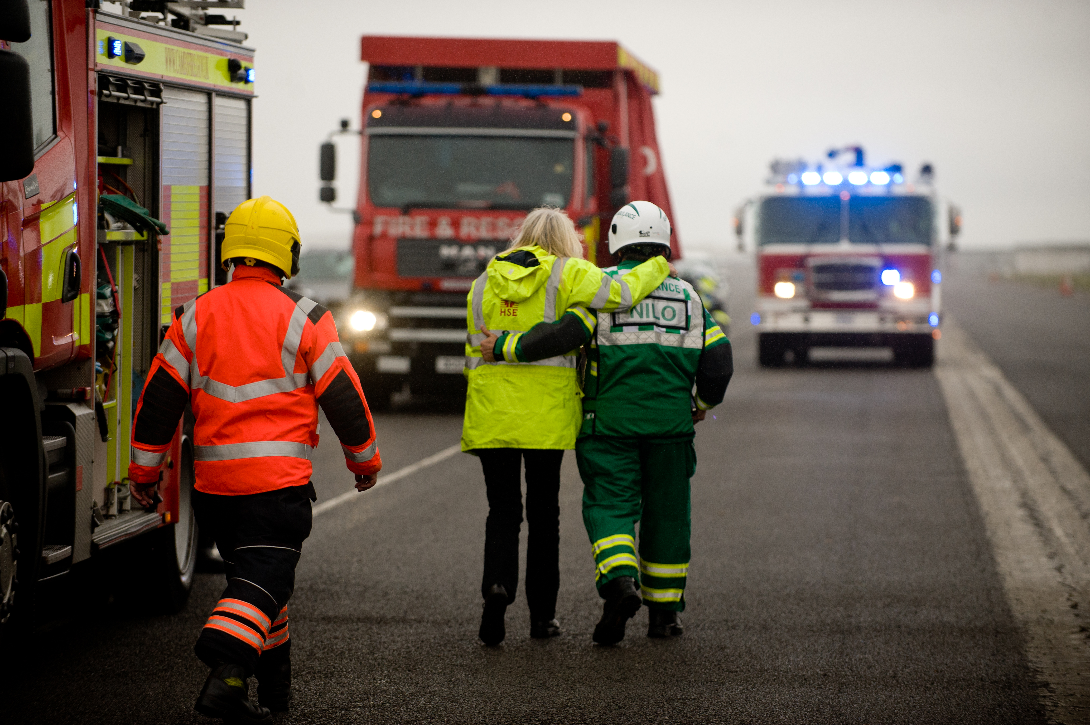 ? Si Barber 07739 472 922 Cambridge constabulary, firefighters and emergency services conducting an exercise of dealing with a chemical accident and spillage. Picture shows: injured and walking wounded being led away by firefighters (wounded played by actors)