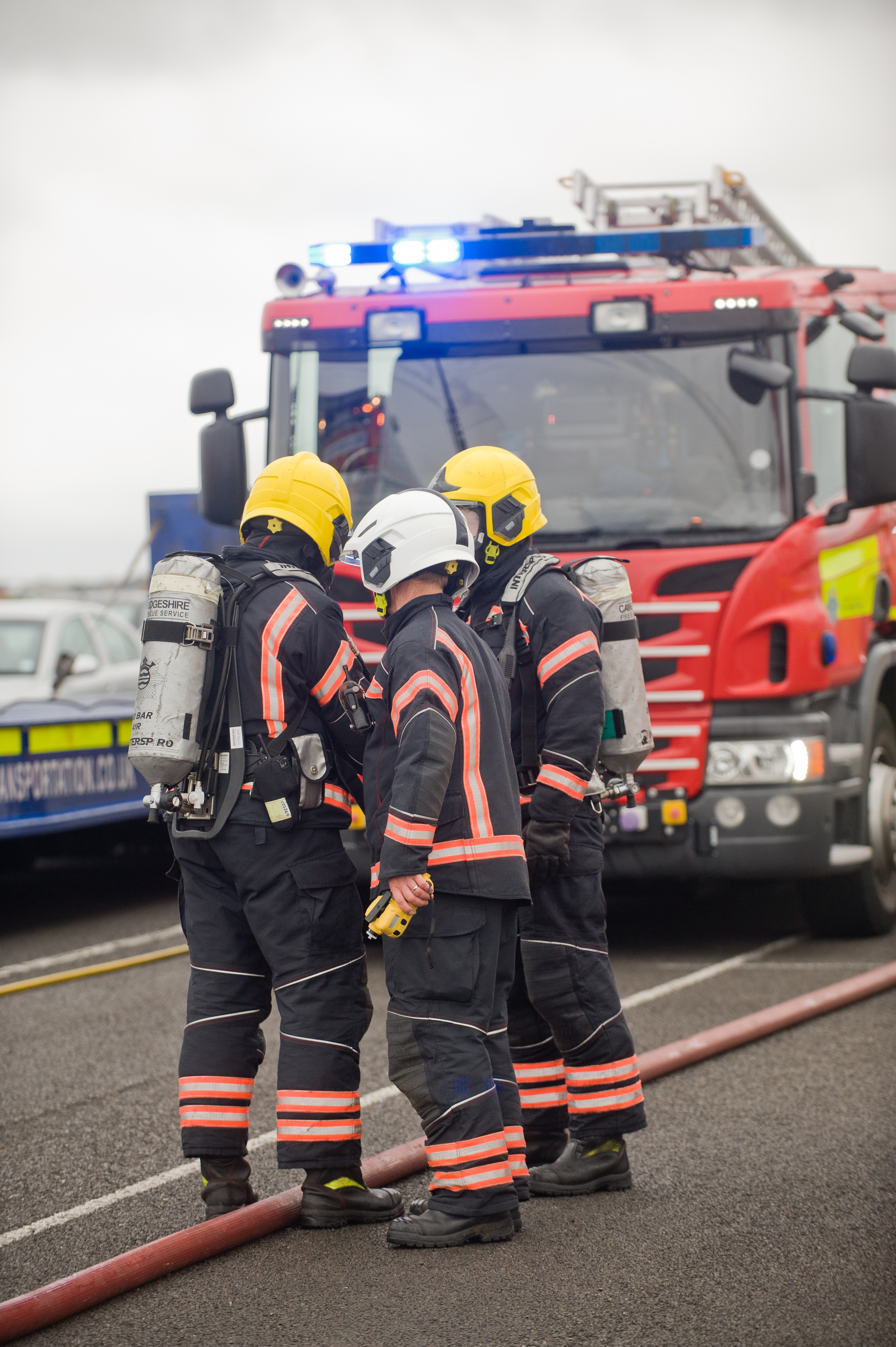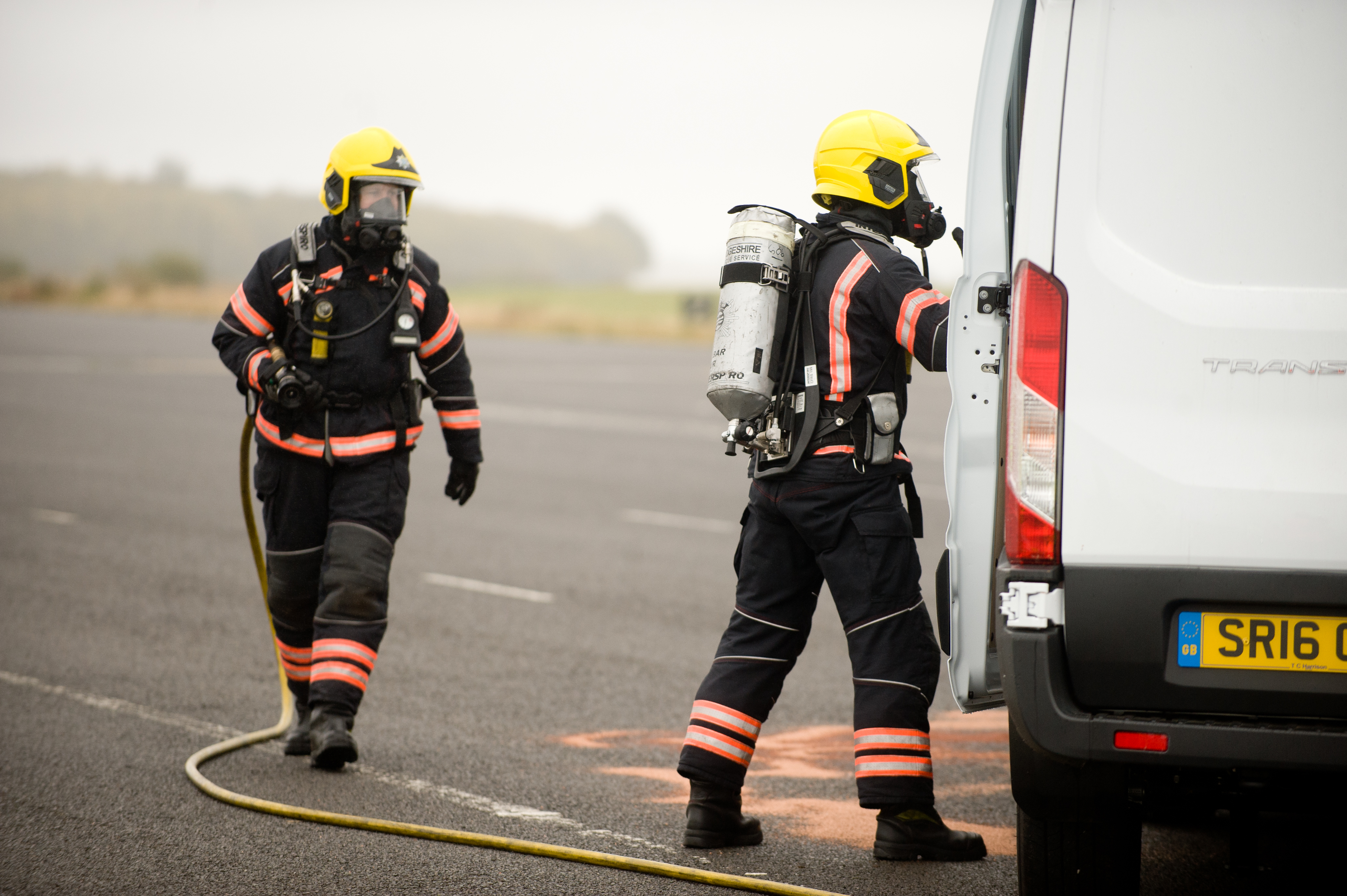 ? Si Barber 07739 472 922 Cambridge constabulary, firefighters and emergency services conducting an exercise of dealing with a chemical accident and spillage. Picture shows: Firefighters with breathing apparatus approaching the vehicle.