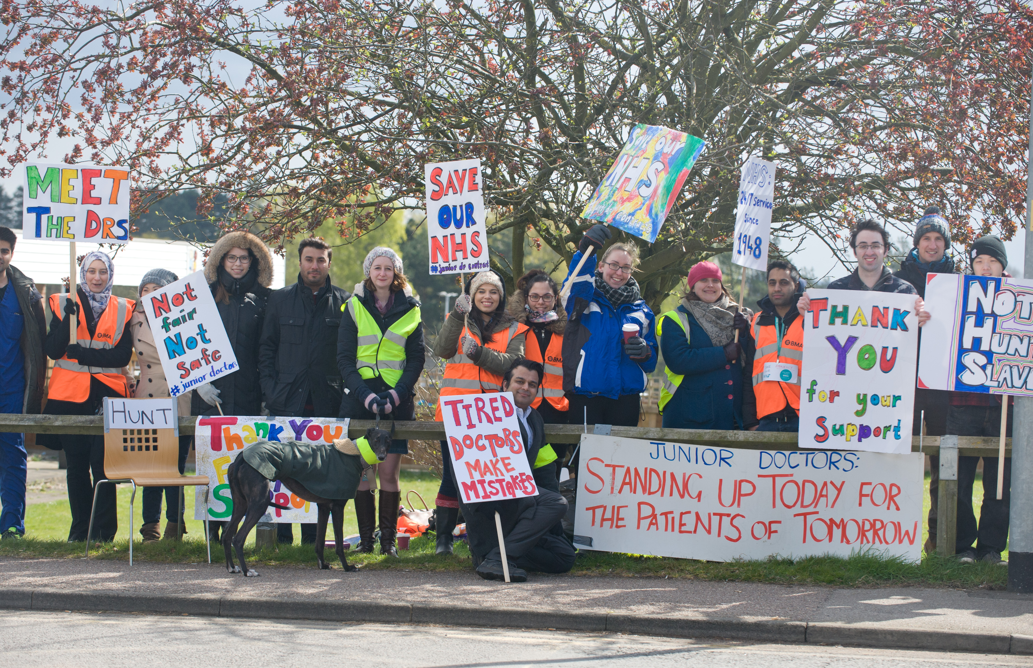 Doctor's protesting outside the Queen Elizabeth Hospital, Kings Lynn, Norfolk on the first day of their first ever strike, 26th April 2016.