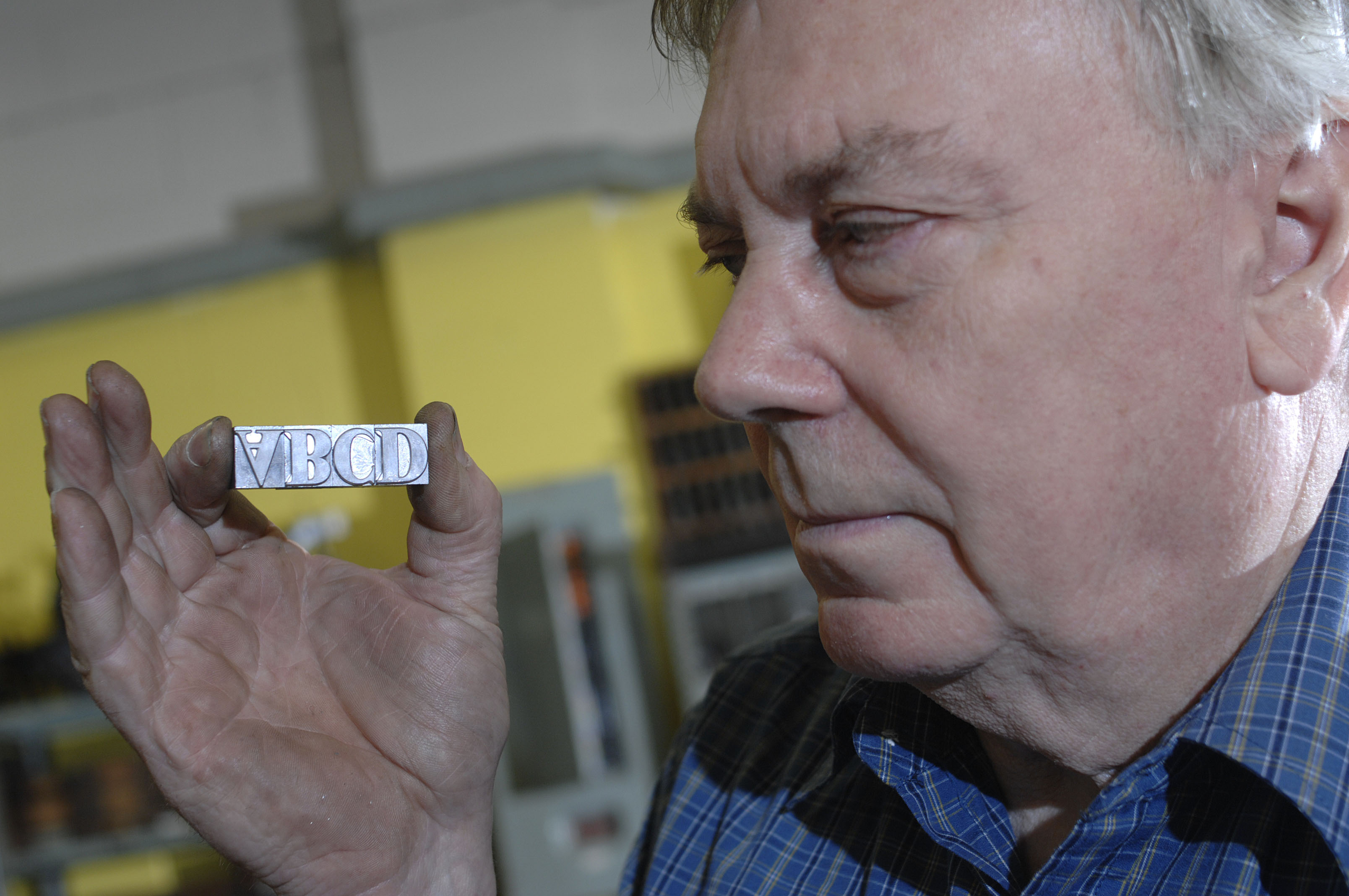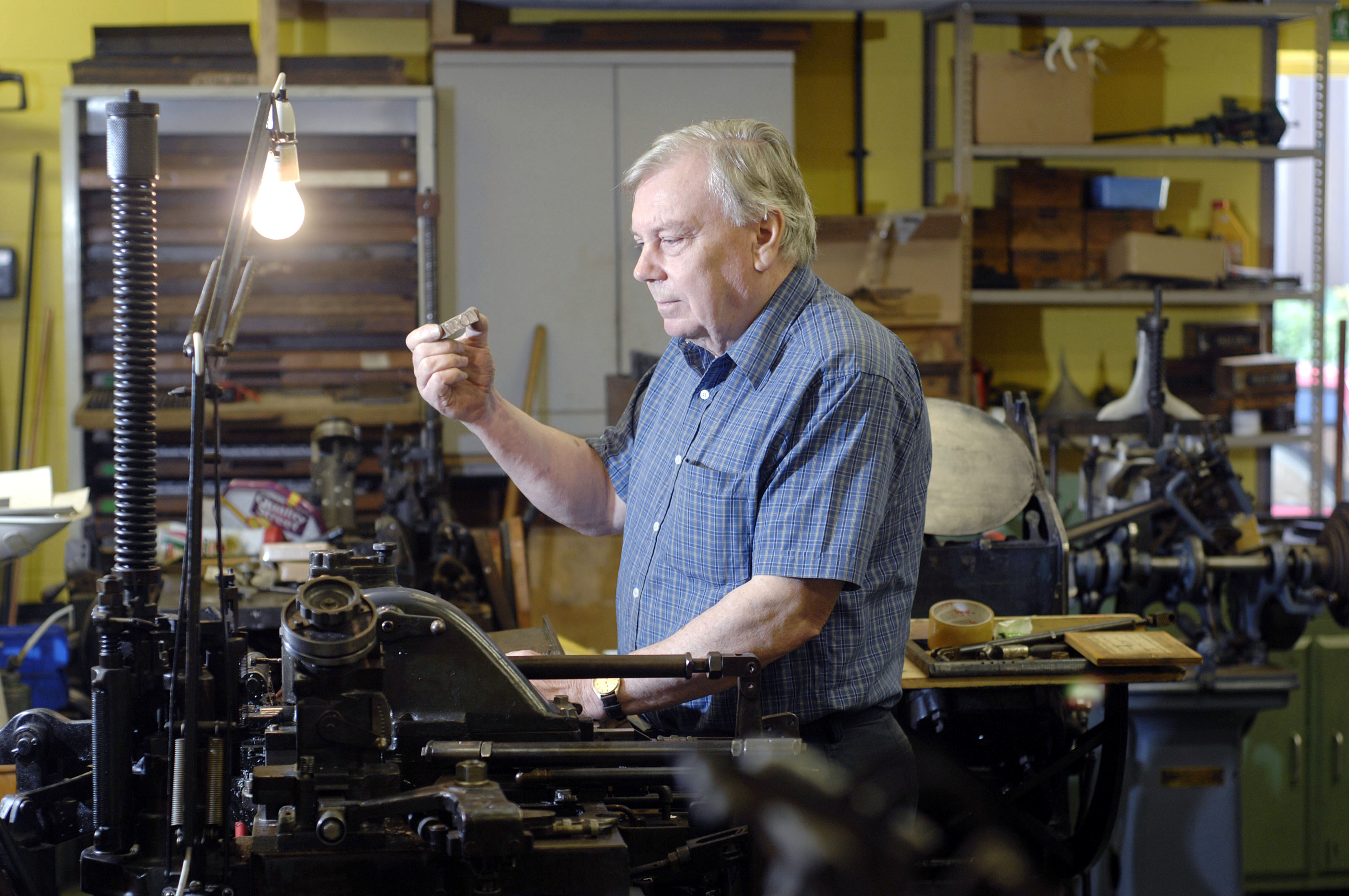 Pic by Si Barber - 07739 472 922 Traditional printer Brian Hubbard with 'hot metal' lead type, North Walsham, Norfolk.Ordered by Rebecca 171006