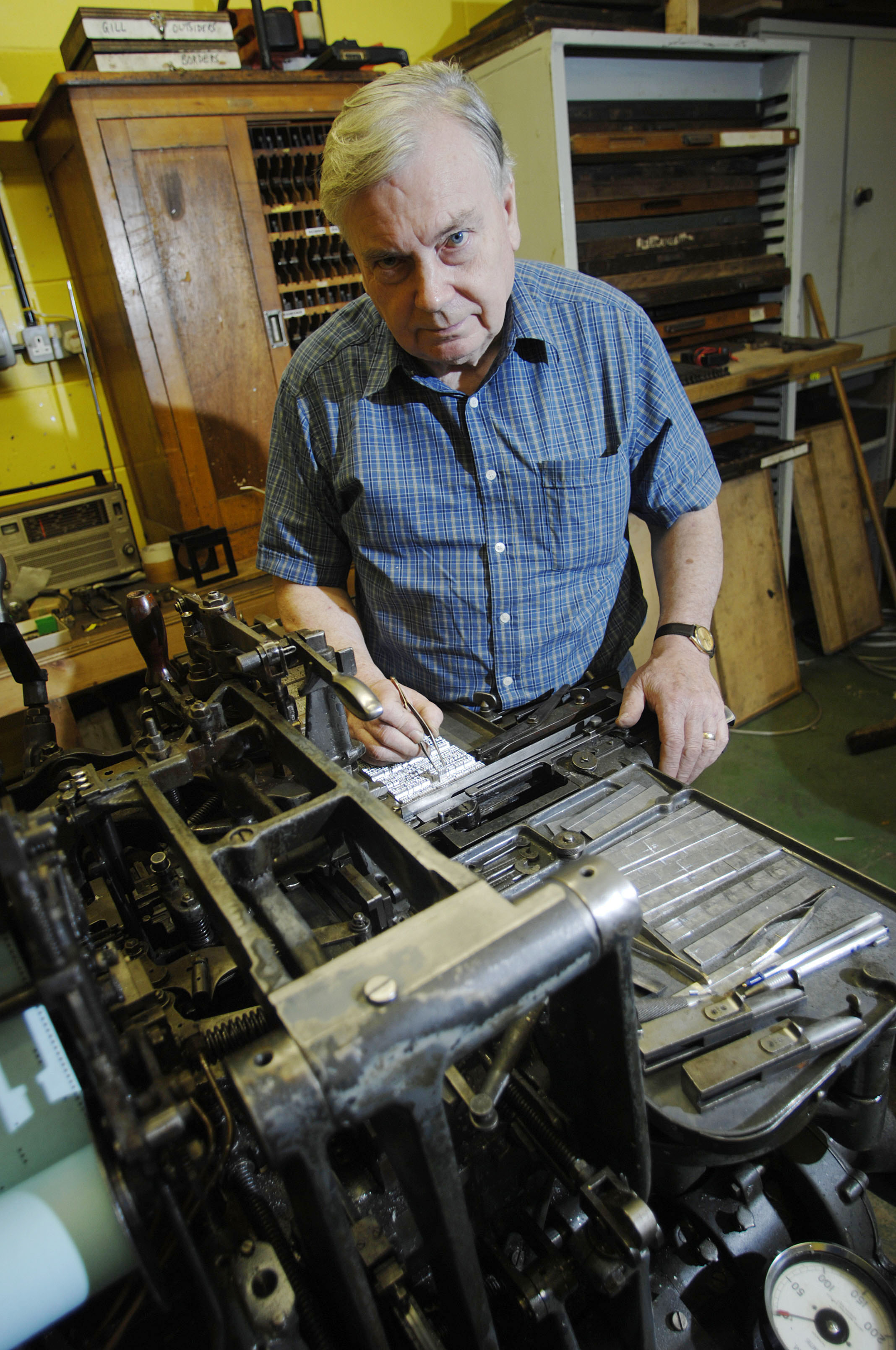Pic by Si Barber - 07739 472 922 Traditional printer Brian Hubbard with 'hot metal' lead type, North Walsham, Norfolk.Ordered by Rebecca 171006