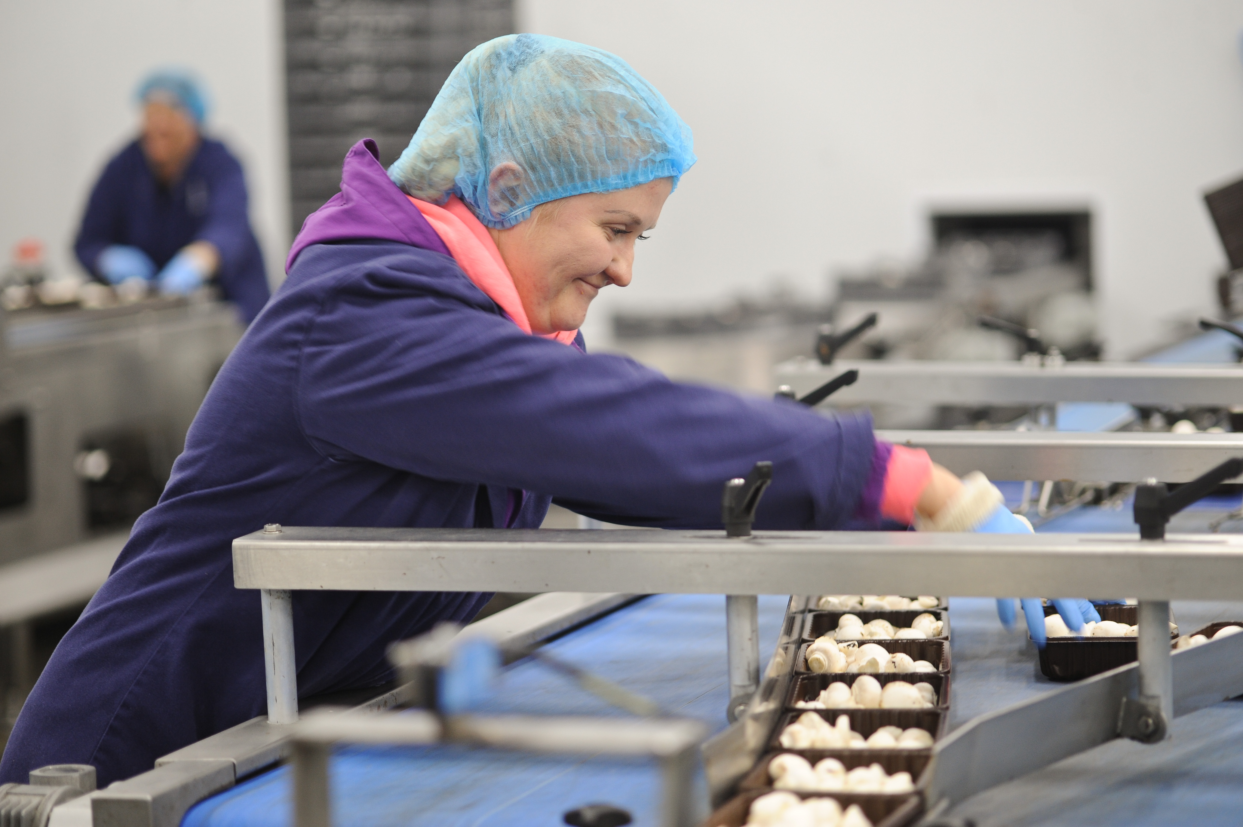 G's vegetable growers near Ely in Cambridgeshire. The company employs and provides accommodation and facilities for many workers from Eastern Europe. Picture shows - Mushroom growing and processing.