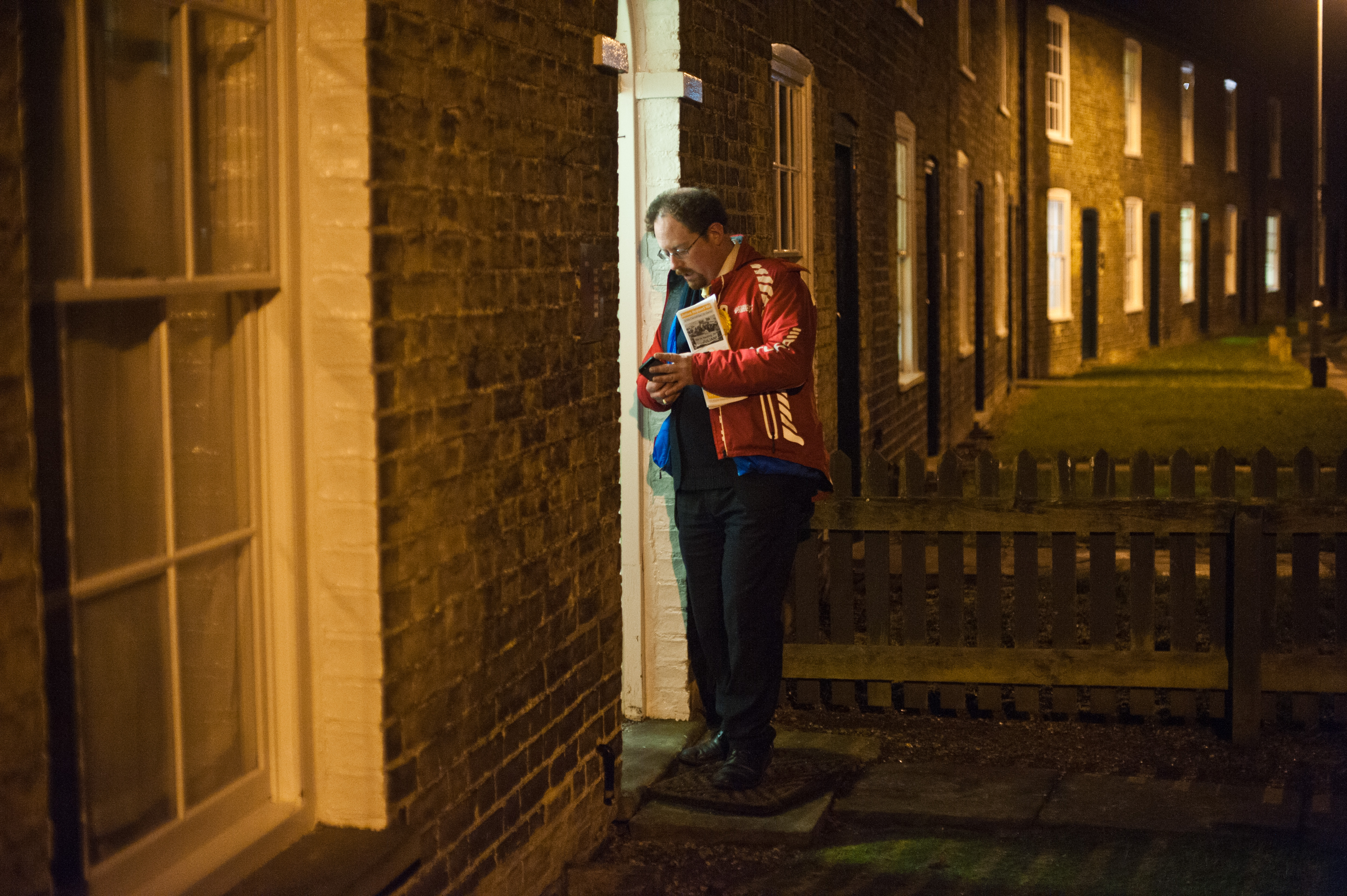 Pics ? Si Barber. Ordered by Marcus Cotton. Text by Matthew Engel. Cambridge MP Julian Huppert canvassing voters using the Voter Activiation Network app on his phone .