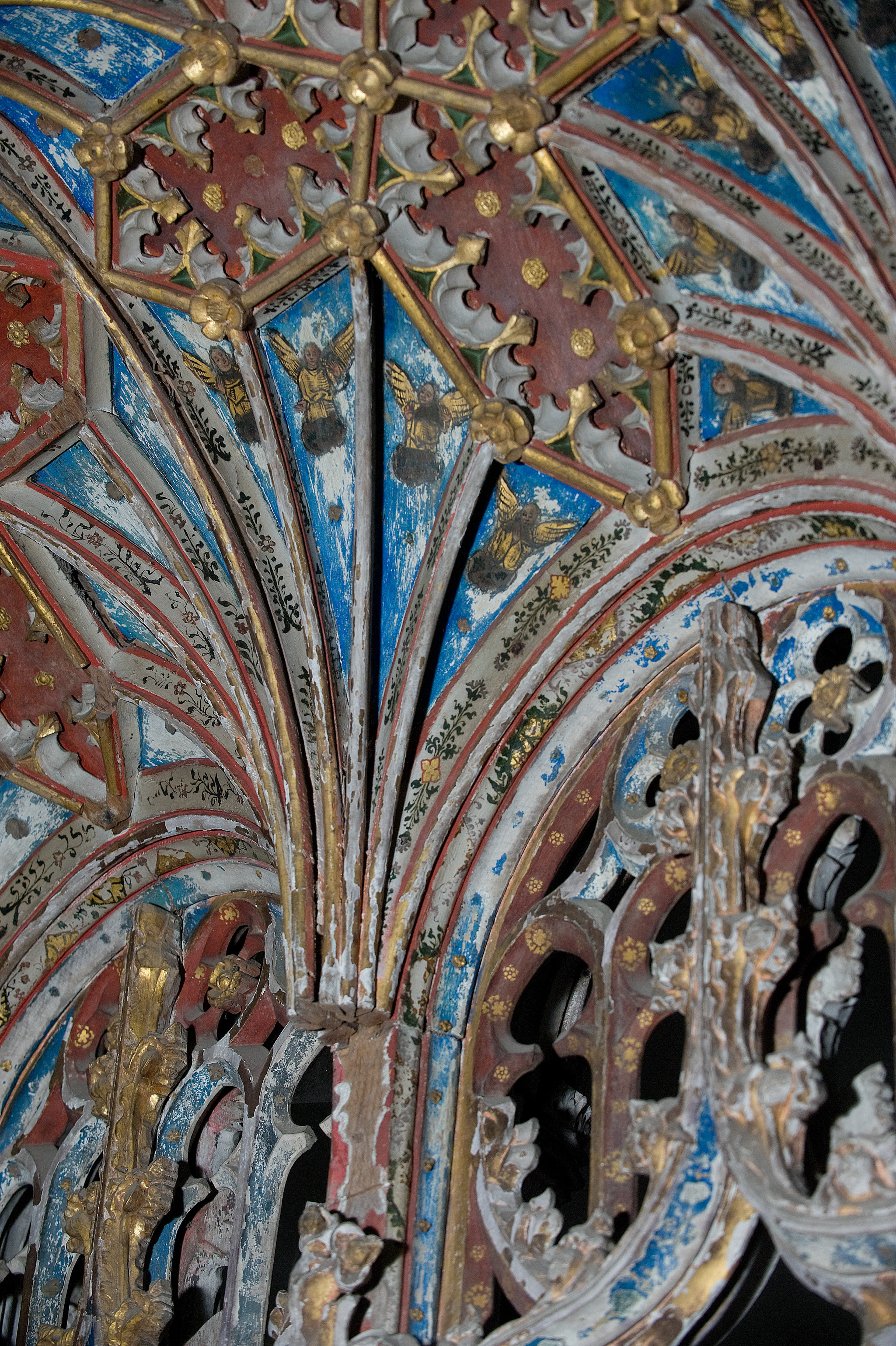 The rood screen and detail at the church of St Andrew, Bramfield, Suffolk. The surviving screens show Matthew, Mark, Luke and John, and St Mary Magdalene.
