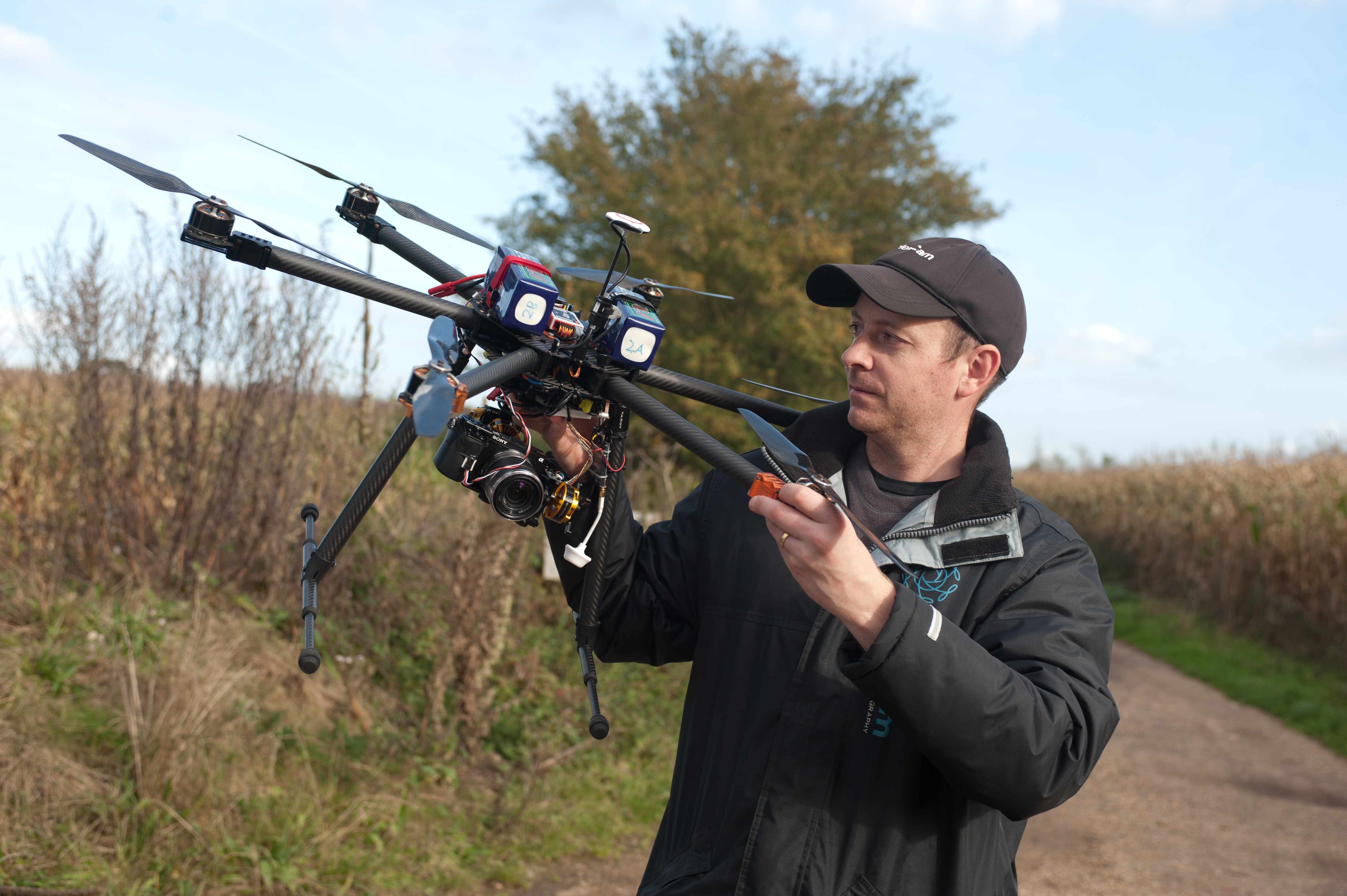 A pilot flying an agricultural drone over a crop of sweetcorn