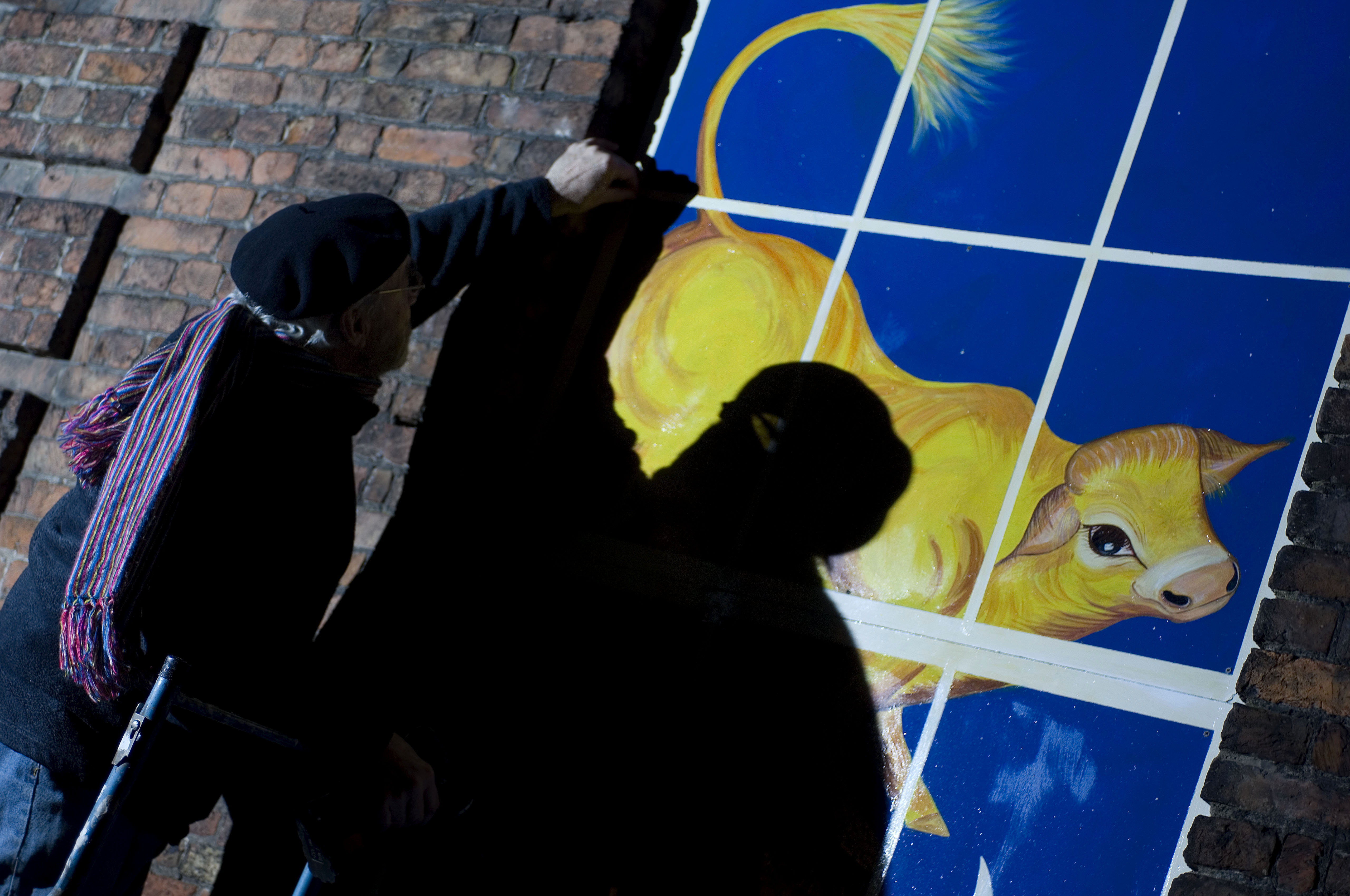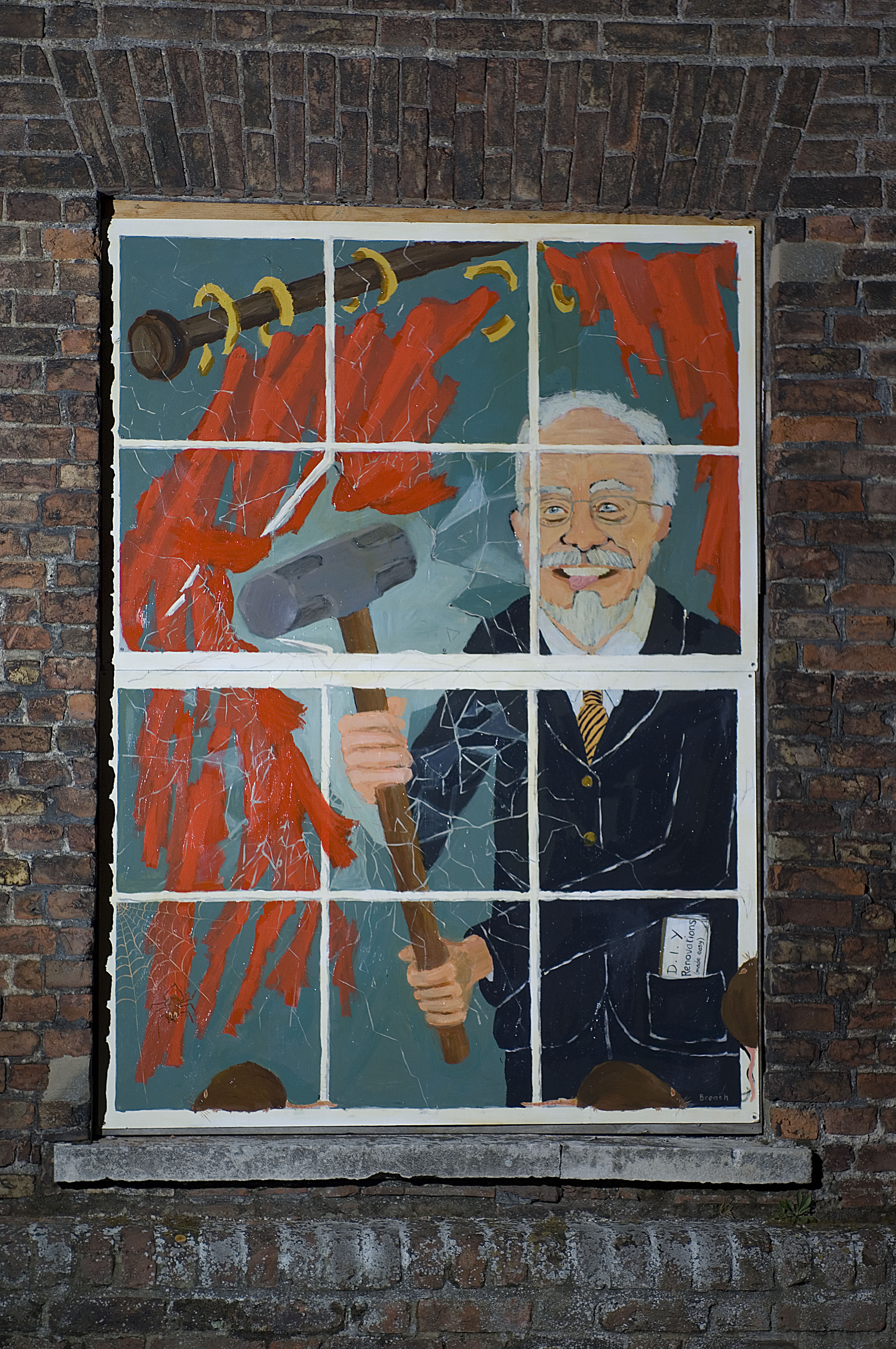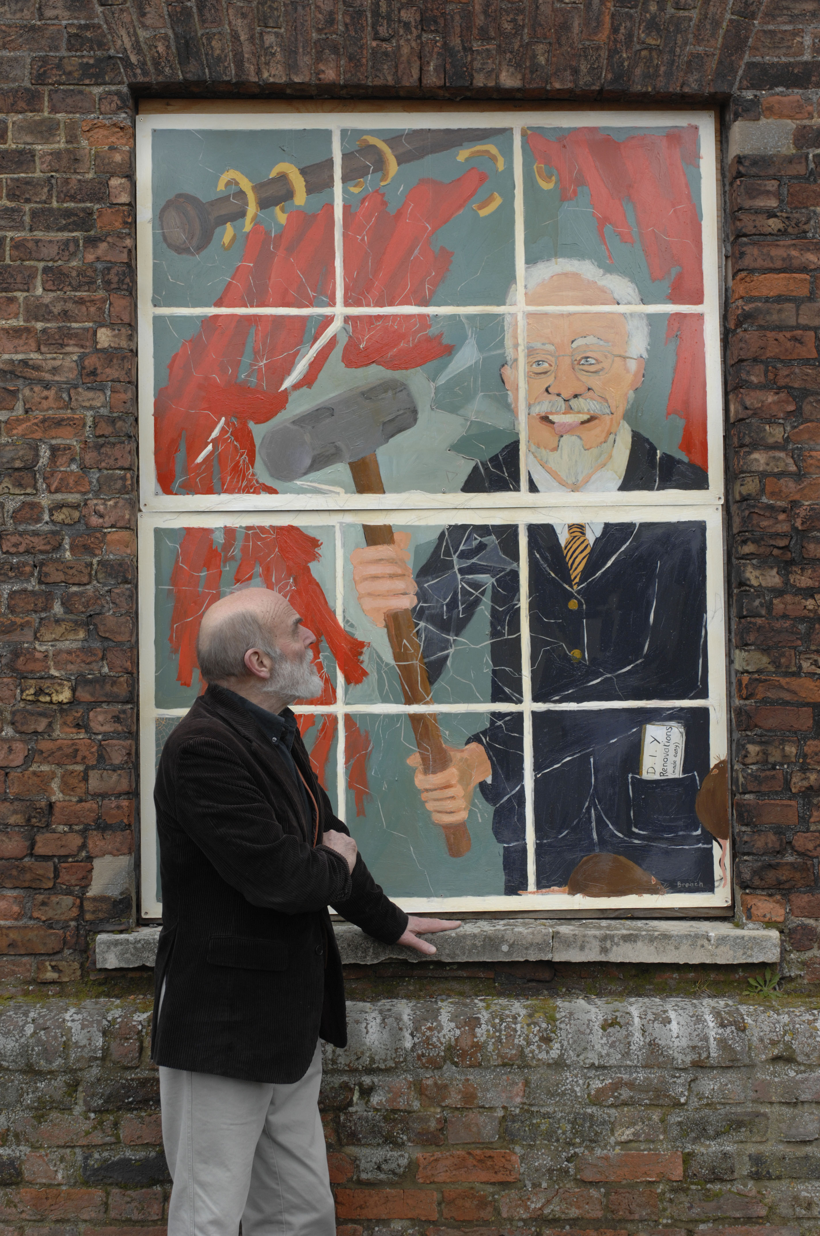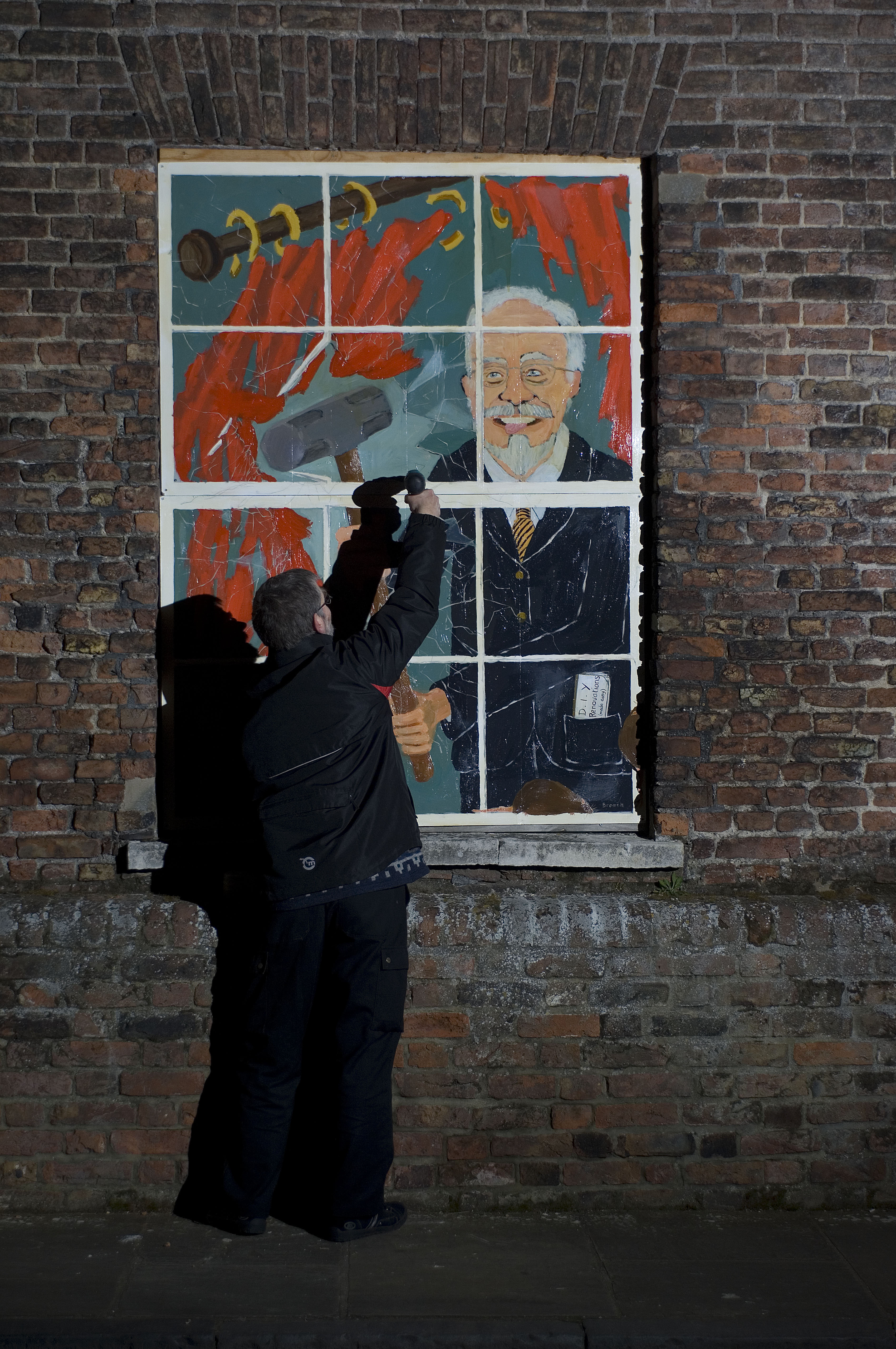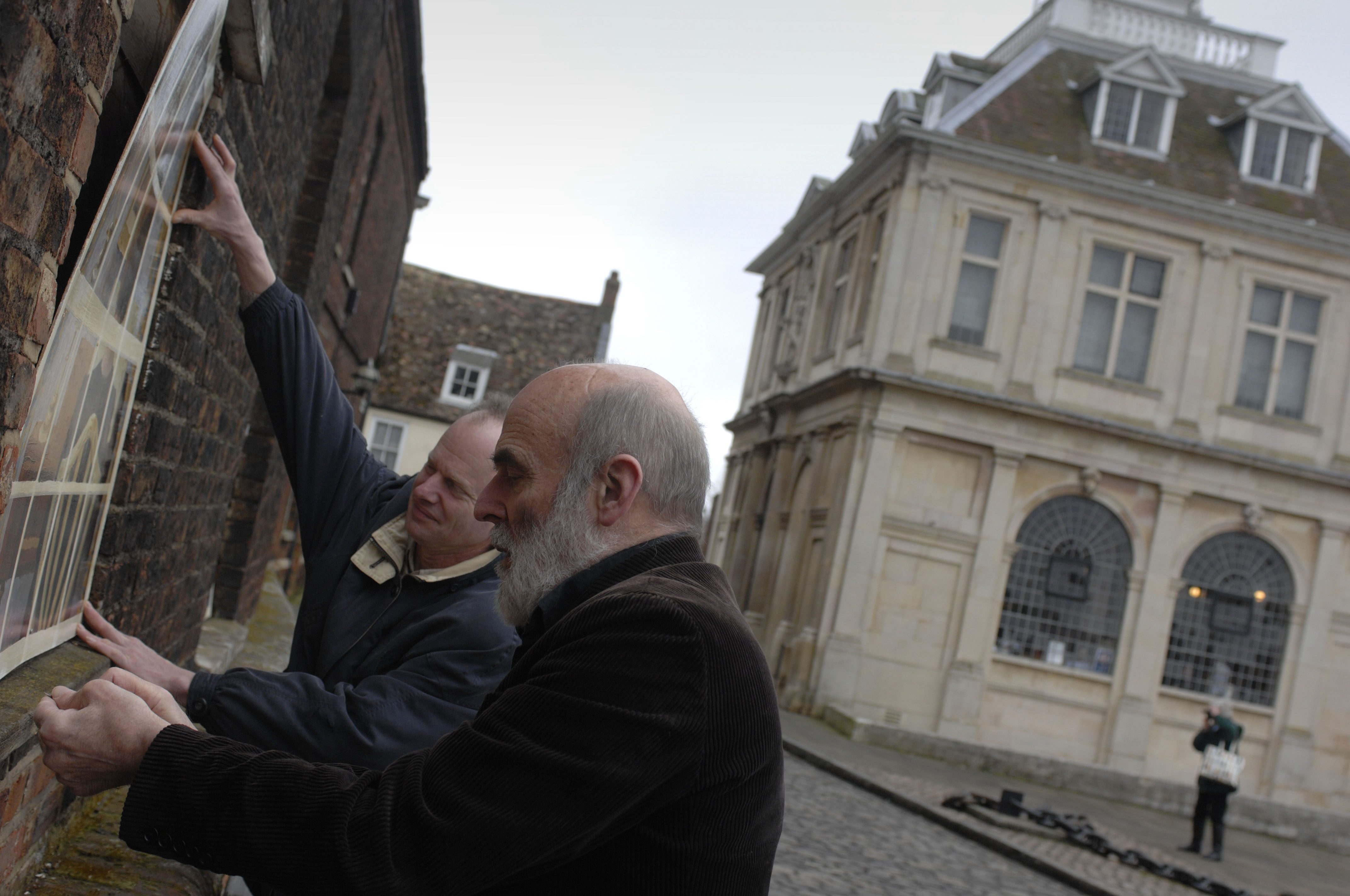 Guerilla conservationists in Kings Lynn erecting art work to improve the facade of Purfleet House which is said to be owned by developer Roger Gawn. The property has been the centre of a dispute which has seen conservationists petitioning the owner to repair the property.