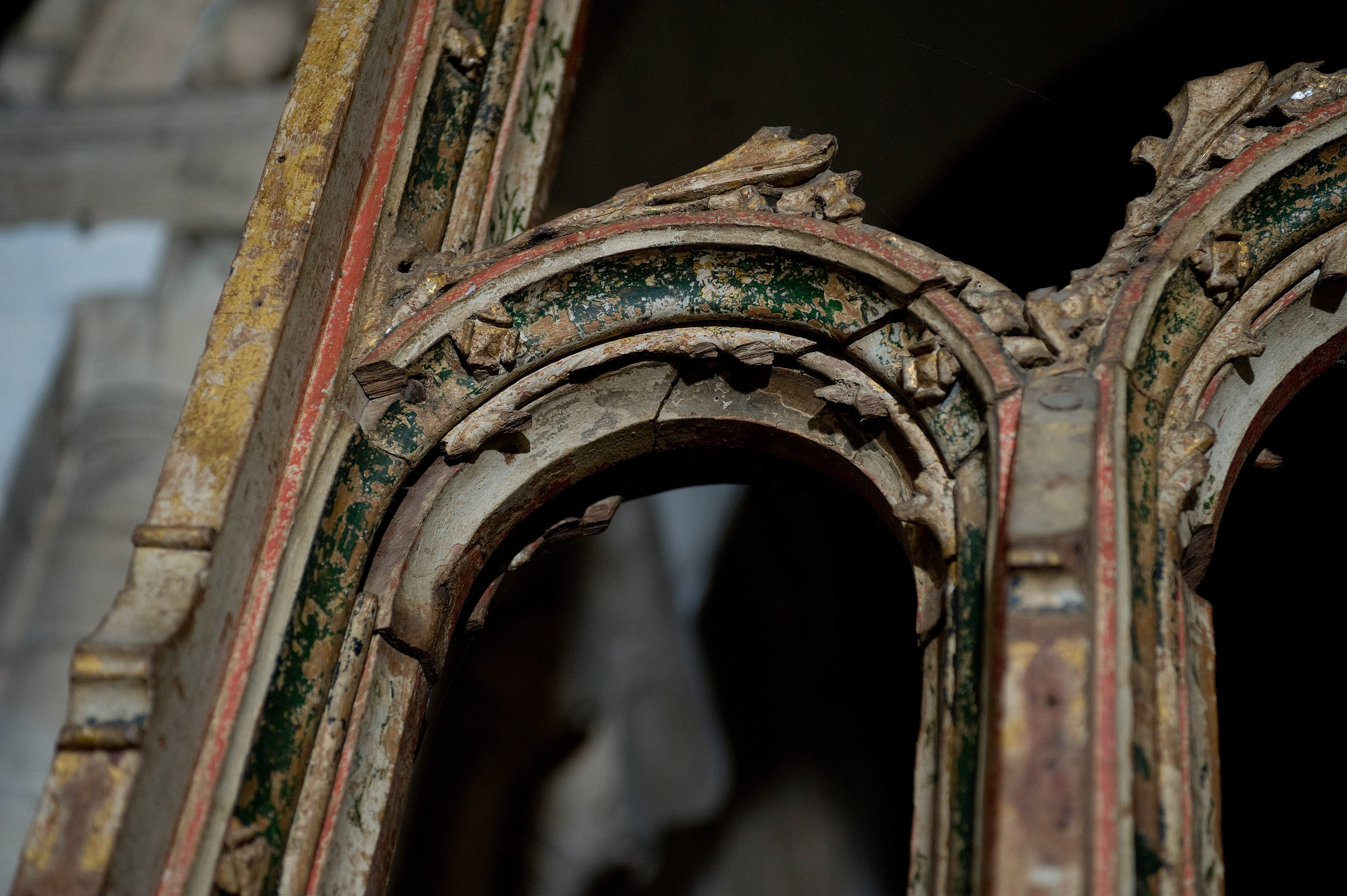 The rood screen and detail at St Mary's Church, Attleborough, Norfolk,UK. From the North (left) side, St John the Baptist , St John the Evangelist , the Blessed Virgin and Child. On the South side St Thomas of Canterbury, the Holy Trinity, and St Bartholomew. The church features a wall painting of the annunciation.