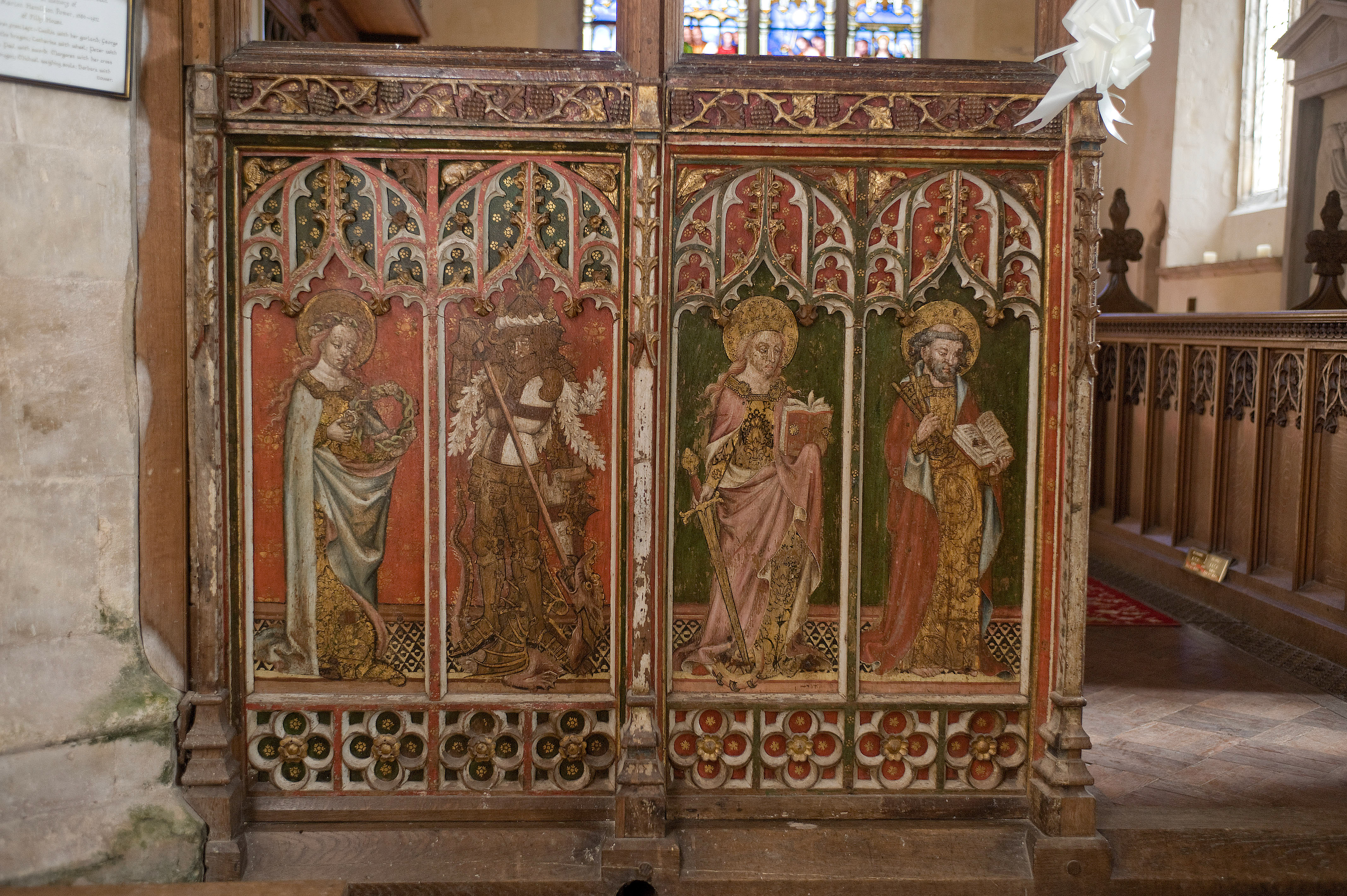 The rood screen and detail at All Saints church, Filby, Norfolk, UK. From the left (North) side the figures are identified as St Cecilia , St George, St Catherine , St Peter , St Paul , St Margaret , St Michael and St Barbara.